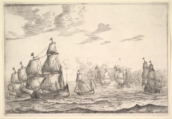 Editor: This etching from 1656 by Reinier Nooms, titled "Harbor with two large sailing ships," has such intricate detail. The precision of the lines is amazing, but I’m wondering about the real story here; what aspects of life are shown or not shown? What do you see in this piece? Curator: Well, let’s start with the obvious. Nooms was a sailor himself, so he understood the labor involved in maritime activity. This wasn’t just an artistic exercise; it reflects lived experience and economic realities. Look closely: the workers on the docks, the scale of the ships indicating their role in trade… Editor: Yes, I noticed that! I had previously seen many landscape paintings showing idealized scenery, while this one appears to show commercial activity front and center. Curator: Exactly. Nooms presents a world where the sea isn't just a pretty view. Consider also that printmaking itself was a means of circulating information and visual culture. These images were commodities, fueling an expanding market for art accessible to a wider audience. Who was consuming these images and what did that mean in terms of shaping perceptions of maritime trade? Editor: So the etching wasn't just documenting the harbor; it was part of the economy it depicts. Would that mean this print wasn't created purely as art, but also a product with utility? Curator: Precisely! By exploring the labor involved in its making, its circulation, and the social context it reflects, we challenge the boundaries separating “art” from “craft” and acknowledge the economic underpinnings of artistic production. What new insight does this provide? Editor: This gives me a lot to think about – not only regarding Nooms' choices and methods, but regarding the art world during that era!