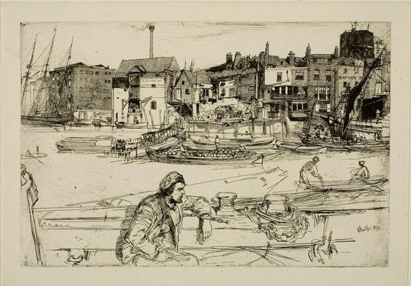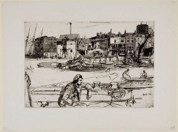 Editor: So, this is Whistler’s “Black Lion Wharf,” created in 1859. It's an etching, and it's striking how detailed he makes a rather gritty industrial scene. What's your read on this piece? Curator: It’s interesting you call it "gritty," because Whistler presented these Thames views to a public increasingly distanced from the realities of riverside labor. Look at how he gives us glimpses of industry – the signs, the cranes, the workers – but frames it within an aestheticized, almost picturesque scene. How might that framing have shaped public perception of the working class at the time? Editor: That’s a great point. It almost feels like he’s documenting a vanishing world, making it palatable for a different audience. Were these prints widely circulated? Curator: They were intended to be. Whistler was engaging with a broader trend of printmaking, which made art more accessible. Etchings like this allowed people to acquire "art" of London without necessarily commissioning paintings. This democratization also influenced how artists engaged with social realism, carefully choosing what to depict and how. Do you see any clues as to whom Whistler thought his audience would be? Editor: Well, the detailed foreground suggests someone with the time and inclination to appreciate the skill involved. It feels more like observing than participating. And perhaps that distance, that aesthetic appreciation, was part of the appeal? Curator: Exactly. Consider the debates around realism in the mid-19th century – the tension between honest depiction and the potential to shock or offend the sensibilities of the art-buying public. Whistler navigates that tension quite skillfully here, wouldn't you agree? Editor: Absolutely. I hadn't considered the artist's audience, or how it informs his aesthetic choices. Thanks, that gives me a whole new perspective on Whistler. Curator: It also highlights how artistic choices contribute to shaping a viewer’s socio-political understanding, doesn't it? A crucial reminder of the active role art plays in public life.