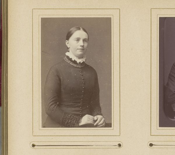 Curator: This is an exquisite portrait created sometime between 1872 and 1889 by Beernaert Frères. What we're looking at is a gelatin-silver print, showcasing a woman in remarkable detail. Editor: My first impression? Restraint. The color palette is subdued, nearly monochromatic, emphasizing textures and the sitter's somewhat severe composure. It really makes me wonder about the social codes at play when this was produced. Curator: Absolutely. Photography, still quite novel then, held immense social power. Its adoption by studios like Beernaert Frères made portraiture more accessible, but also dictated new performative rules of class and identity. The slightly forced smile and precise attire were designed to project respectability. Editor: Agreed, it's carefully constructed. Look at the tactile quality rendered in the print; you can almost feel the weight of the fabric, the precise setting of each pin. It reveals so much about the time it took to produce the work. It must have involved skill and craftsmanship, the chemicals, paper and dark room techniques… I wish we had more details about the materiality and methods deployed here! Curator: Indeed. While it lacks the expressive brushwork of painted portraiture, its capacity for precise replication granted photography unmatched authority in constructing social memory. Such works were increasingly commissioned as both mementos of family connection and public declarations of self. Editor: Thinking about consumption, prints such as these probably reached wide audiences too—copied, exchanged, archived... Unlike paintings, the reproducible nature democratized imagery to some degree while solidifying particular canons of taste and appearance. Curator: And this specific gelatine-silver print technique marks an interesting point where artistic ambition merges with the rise of mass cultural imagery, blurring divisions. These studios operated within rapidly evolving media economies. Editor: It's a reminder that even in capturing ‘realism,’ both subjects and producers like Beernaert Frères operated within, and reinforced, constructed roles, with implications reaching far beyond single image. Curator: A worthwhile contemplation on representation. Thank you! Editor: My pleasure! The photograph feels all the more captivating after unraveling those connections.