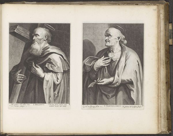 Curator: Here we have a fascinating print from Nicolaes Ryckmans, likely created sometime between 1616 and 1654, entitled "Apostel Jakobus de Meerdere / Apostel Johannes," residing in the Rijksmuseum. Editor: The immediate feeling is one of contrasted strength and ethereal grace, quite typical of Baroque sensibilities. The image has such distinct halves! Curator: Indeed. Let’s look at Ryckmans' compositional strategies. Notice the deliberate parallelism in the figures' poses, and the employment of shadow and light to enhance depth in both the images of Saint James the Greater, and Saint John. How does that semiotic construction manifest for you? Editor: The strategic use of chiaroscuro lends weight to St. James, with his attributes like the staff. His depiction has the air of authority; a tool often used when attempting to display prominent religious and historical figures. It is a familiar iconography used in asserting authority of the Church and solidifying faith through a visual language, in contrast, Saint John with the chalice, feels like light is emanating from the figure, not cast upon it. It is definitely intentional. Curator: Precisely! Notice the intricate details within each engraved line, creating subtle variations in tonality that define form, like that chalice. Each calculated mark accentuates the narrative of each saint. The halo of the staff bearer versus the saint of divinity. There is this opposition that creates the art! Editor: The medium, the printed engraving, too, played a huge part in circulating the idea and perception of Saints in early modern Europe. This isn't just devotional; it's also about the dissemination of visual and social ideals. Consider its function beyond pure aesthetics: a tool for religious messaging amid reformation and Counter-Reformation fervor. Curator: A beautiful encapsulation. It’s in works such as these that we see the blending of formal innovation and socio-cultural context, an artistic convergence with layers of meaning that speaks beyond its mere image. Editor: Absolutely, engaging with this piece offers insight into how the art served not only spiritual reflection but played an active role in shaping social attitudes and visual culture. A fine line work between what once was, and our impression now.