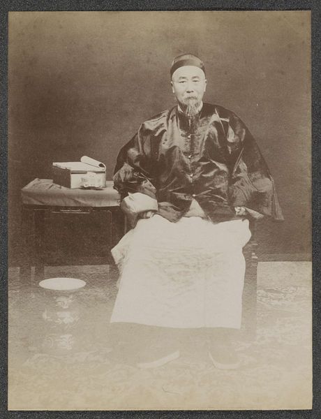 Editor: This is "Négociant," a photograph from the 1870s by Raimund von Stillfried. I’m struck by how deliberately composed it feels, with the subject positioned so formally next to that carefully placed bonsai. What symbols are at play here, do you think? Curator: That formality itself is a significant symbol, a constructed representation. The sitter, posed with the bonsai, signifies cultivation, control – not just of nature, but of self-presentation. Note the details in his clothing; do you see how the layering, the fabric, speaks to status? Editor: Yes, I see the rich colors and the cut of his robe. It suggests prosperity and a certain level of power. And the bonsai tree almost echoes him in miniature, like a cultivated reflection. Curator: Precisely! Consider the cultural weight of bonsai. They represent harmony, patience, the art of refinement. How does the artist use these established visual cues to shape our understanding of the "Négociant"? Editor: So, Stillfried is not just documenting, but constructing a narrative about this man through these loaded symbols? Perhaps commenting on East-meets-West in the age of trade? Curator: Indeed. He's crafting a visual story, a cultural encounter seen through the lens – literally and figuratively – of a particular time and place. Does the work remind you of other portraiture you have studied? Editor: It reminds me of European portraiture from around the same time – stiff and stately, but there's an exotic twist, because the context and setting are entirely different. The blending is so interesting. Thank you! This has certainly given me a fresh pair of eyes to use with portraiture in general. Curator: You're welcome. Now you may see symbolism in so much of what we see around us. Look beyond face value and connect the dots, always.