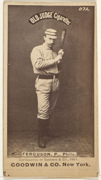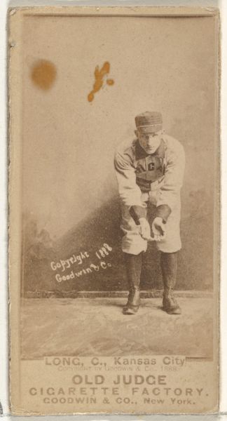 Editor: This is "Myers, Catcher, Indianapolis" from the Old Judge series for Old Judge Cigarettes, created in 1887 by Goodwin & Company. It’s a sepia-toned photograph on a small card. He seems a little stern, doesn’t he? What stands out to you about this image? Curator: I think the photo opens a really fascinating window into the commodification of sports and celebrity in the late 19th century. Consider the way Myers, a working-class athlete, is being used to sell a product like Old Judge Cigarettes. What does it tell us about the emerging cult of celebrity at the time, and how were images like this circulating and influencing perceptions of masculinity, labor, and leisure? Editor: So, it’s not just about baseball, but about marketing and identity? Curator: Absolutely. And the very act of distributing these images within cigarette packs suggests a certain social currency. Who was collecting these? Were they predominantly white men? How does the image contribute to the construction of a specific, perhaps exclusive, identity associated with consuming both baseball and cigarettes? Furthermore, the name "Old Judge" alludes to authority and judgement – whose authority is being invoked here, and what values are being judged as "good?" Editor: It’s making me think about who gets to be represented and how. It’s like an early form of branding a lifestyle. Curator: Precisely! And within that framework, who is excluded, and what narratives are being silenced or marginalized? We can unpack so much from this seemingly simple portrait. Editor: I never thought about baseball cards that way before. Seeing it as a way to promote a certain male identity changes everything. Curator: Exactly. Analyzing historical images within their social and political contexts enables us to reveal those hidden layers.