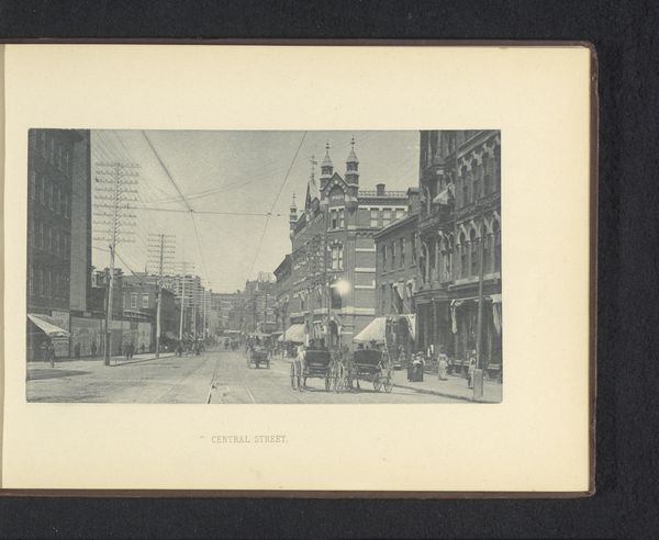 Editor: So, this photograph, "Gezicht op het treinstation van Lowell," taken before 1892, it feels almost like a stage set, doesn’t it? Static and posed, yet hinting at so much untold narrative. What sort of symbolic echoes do you see in this cityscape? Curator: The stillness itself becomes symbolic, doesn't it? This isn't just a train station, it's a portal, a threshold to somewhere else. Note the twin towers flanking the station’s entrance. Do they remind you of anything, perhaps from folklore or even religious architecture? Editor: A bit like castle gate towers, or church steeples... symbols of entry or passage? Curator: Precisely. And consider what a train meant then – the height of progress, expansion, opportunity, but also a severing of ties, a leaving behind. All caught within the single image. Note how the people are tiny in relation to the building - it amplifies the imposing nature of progress and institutionalized travel. Are there specific figures that draw your eye? Editor: Now that you mention it, I notice the horses seem to represent older methods and an older, quieter time. Curator: Yes, and observe how the photographer contrasts them. Consider how people felt then, at this intersection of tradition and modernity, this specific place and point in time, caught between different worlds, and represented within a cityscape. It mirrors what so many felt, standing on the precipice of vast societal change. Editor: It's fascinating to consider how even seemingly straightforward documentary images are actually packed with hidden stories. Thank you for this fresh viewpoint! Curator: And thank you. Considering these seemingly mundane places as potent carriers of cultural anxieties provides an entirely new depth.