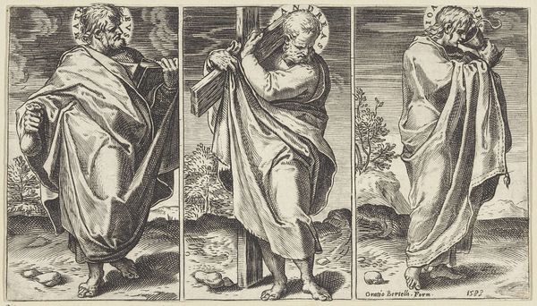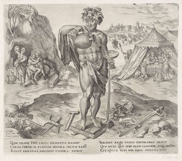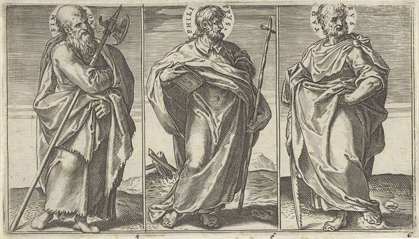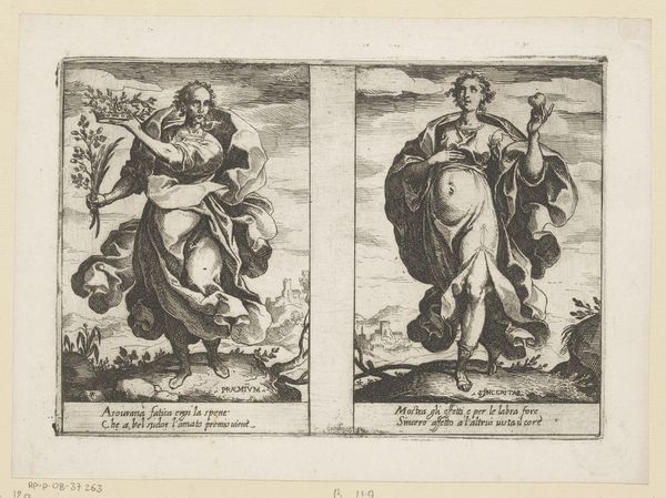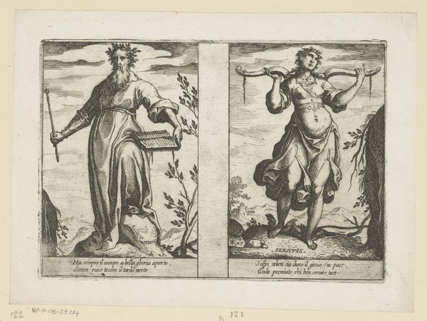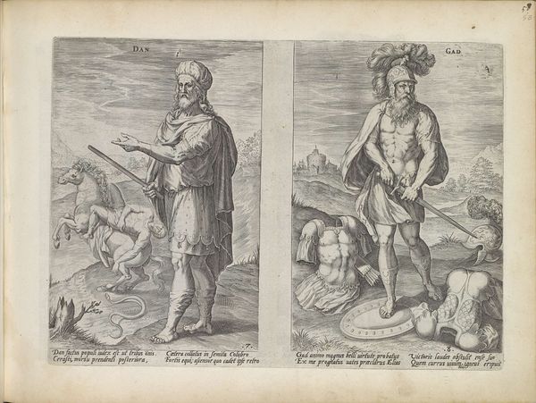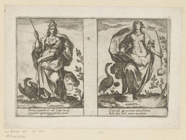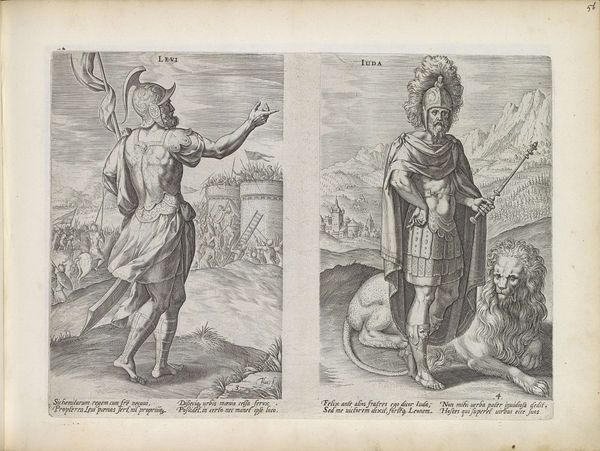 Curator: This engraving, dating between 1585 and 1643, is entitled "Stamvaders Jozef en Benjamin" by Johann Sadeler I. It's currently housed in the Rijksmuseum. Editor: My initial impression is that it's quite austere. The figures, while elegantly posed, have a somewhat somber presence. The monochrome adds to that feeling of seriousness. Curator: Well, engravings often have that quality. Look at how Joseph is depicted, drawing his bow—an emblem of skill and preparedness. He symbolizes foresight and the protective role, an ancestral leader watchful from his city’s walls. Editor: I notice the contrast in their settings. Joseph stands before an established architectural space, whereas Benjamin seems to occupy a more natural and unsettled, potentially dangerous environment, represented by the presence of what appear to be wolves around the defenseless lambs. It is compelling to witness these conflicting scenarios! Curator: Yes, that contrast is significant. Benjamin, accompanied by animals, perhaps evokes innocence or vulnerability, aligning with his youthful image in the biblical narrative. He has dominion, yet also exposes his charge to the dangers, perhaps indicating that protection comes with sacrifice or awareness. Editor: And what of the compositions themselves? There’s a striking linearity in Joseph's portrayal versus the rounded forms of Benjamin's surrounding elements. Is this intentional on the engraver's part? A way of visually differentiating them? Curator: Absolutely, it is very likely. Consider also the verses of Latin at the bottom; the use of classical motifs within such illustrations creates a kind of allegorical intensity. This gives layers of context. Each verse amplifies a symbolic trait. Editor: This close examination allows us to recognize how this piece masterfully blends aesthetic components and narrative impact; the two distinct parts in juxtaposition show unique themes. Curator: Exactly, it’s through those intricate visual cues that meanings crystallize in our own comprehension!