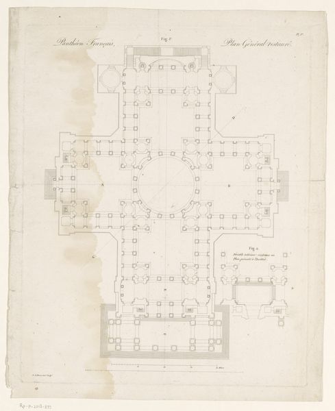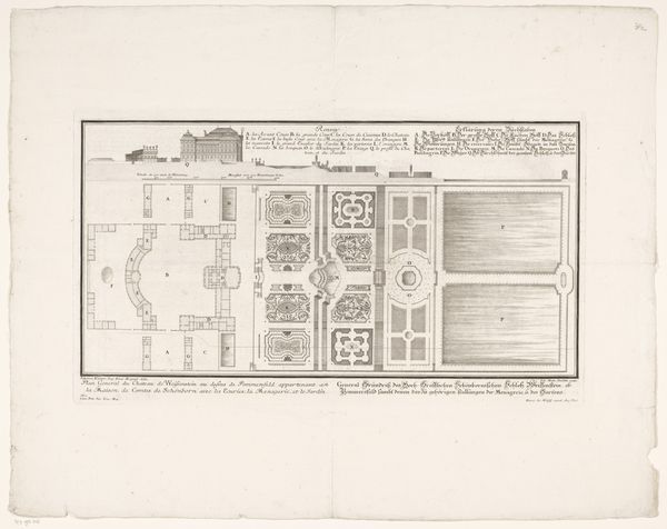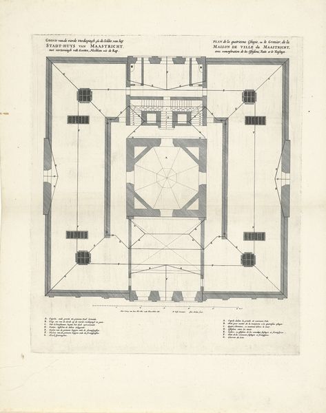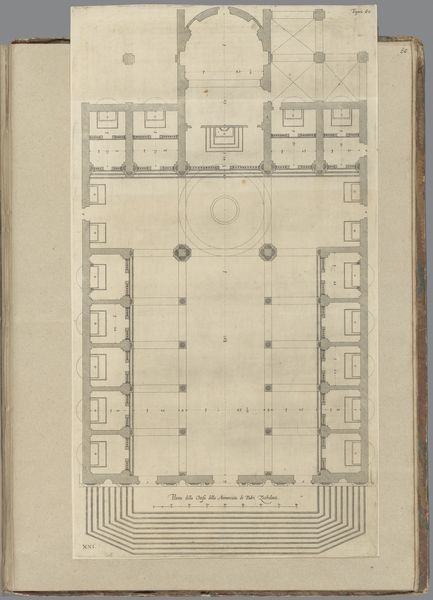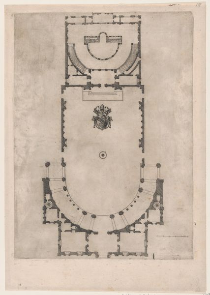 Editor: This is "Plattegrond van de Dom van Milaan," a drawing and print from sometime between 1723 and 1766 by Marc Antonio dal Re. It's a floor plan of the Milan Cathedral. What immediately strikes me is the intricacy of the lines, almost like a complex geometric puzzle. What stands out to you in terms of its structure and composition? Curator: The power of this image lies precisely in the interplay of line and form. Observe how dal Re meticulously renders the architectural blueprint. The network of lines establishes a rhythm, a sequence of repeated elements which are interspersed by geometric changes that encourage a sense of expansion and contraction. This interplay gives the drawing its visual energy. What compositional choices direct our eye? Editor: I notice that the central area is more densely detailed than the outer edges. The lines radiate outwards, creating a visual hierarchy. The geometric progression creates a sort of structured viewing experience. Would you agree that the details in the core speak to a deeper reading beyond just architectural representation? Curator: Precisely. The dense ornamentation at the heart of the structure isn't just decorative, but speaks to the architectural logic. Note how he utilizes the print medium’s inherent capacity for linearity to underscore architectural relationships. Do you find that the Baroque stylistic choice enriches your perspective? Editor: Definitely. Knowing it’s Baroque allows me to see how the embellishments build depth through complex pattern. Looking closely, I'm impressed by how much the medium impacts the geometrical structures depicted here. It reveals so much about artistic, historical, and technological conditions. Curator: Yes, each component contributes to our experience, influencing and molding the viewer's eye. A fascinating example of architectural art through the close combination of media, artistic flourish, and geometric principle. Editor: I see now how important it is to focus on the details themselves. This work exemplifies how form communicates intention, not just information.