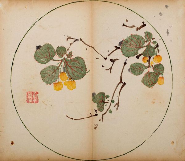 Editor: This is "Fruiting Branch in Circular Fan Shape" by Hu Zhengyan, likely created in the early 17th century. It’s a woodblock print, part of the Ten Bamboo Studio Manual. The delicate lines and the circular composition give it a feeling of serene balance. What strikes you most about the composition? Curator: Note the effective deployment of negative space. The placement of the branch relative to the circle’s edge creates a dynamic tension. The artist manipulates our perception of depth and volume. Do you observe how the varying densities of color and line contribute to this effect? Editor: I see what you mean. The darker leaves and thicker lines pull forward, while the faded sections recede. Curator: Precisely. It demonstrates a sophisticated understanding of formal relationships, transcending simple representation. The circular frame is not merely a border but an integral part of the artwork. Editor: It's fascinating how much can be conveyed just through the formal elements. I’ll definitely look at prints differently now. Curator: Indeed, attending to these aspects reveals the artist's intention and elevates our understanding.