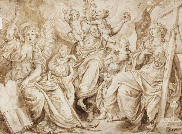 Parmigianino rendered "Circe and the Companions of Ulysses" in ink on paper. The circular composition, dominated by sepia tones, presents a scene teeming with transformative power and classical allusion. The eye is immediately drawn to Circe, poised centrally, as she extends a potion to Ulysses’s companions, who are rendered with anxious expressions. Parmigianino masterfully uses line and form to distinguish between the human and the monstrous. Note the sinuous lines of the creatures contrast with the more angular contours of the architecture in the background. The texture created by the ink wash gives depth, especially to the figures contorted by Circe’s magic. The drawing's thematic heart lies in its exploration of metamorphosis—a concept that destabilizes fixed categories. Parmigianino uses the circular format not merely as a frame but as a symbolic enclosure, heightening the viewer’s sense of being enveloped in Circe’s transformative realm. The interplay between classical narrative and stylistic innovation reflects a broader cultural moment where artists challenged the established conventions of representation.