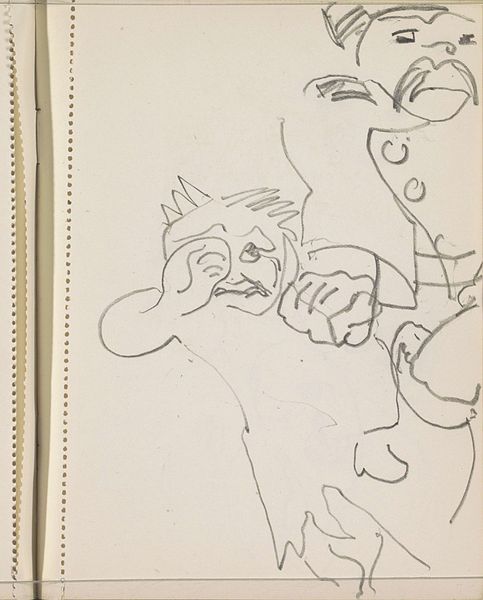 Curator: Let’s turn our attention to “Three Figures in a Café”, a pencil drawing by Max Beckmann. It appears to be a page torn from a sketchbook. What strikes you first? Editor: The visible, frantic process. I see a layered approach: the light pencil markings, revisions, erasures...almost like an archaeological dig into thought itself, right? I'm really drawn to the immediacy of the piece. Curator: Absolutely, the sketch quality imbues it with raw energy. Notice how even in these early marks, the figures seem almost burdened, caught in some invisible tension. It echoes typical German Expressionist themes of alienation. The hat, too, holds a prominent space in the composition. What symbolic reading would you assign it? Editor: Well, the large, floppy hat on the central figure – obscuring part of the face. That might suggest hidden social strata or perhaps economic circumstances forcing concealment? You know, the materials themselves can inform us. Inexpensive paper, a common pencil… this suggests it was created amidst practical and economic constraints. It wasn't meant for "high art", maybe only a preliminary study. Curator: Perhaps, but I lean towards psychological layers. The hat may signify a self-imposed barrier, an intentional disguise related to social performance, fitting with the cafe setting and the act of people-watching. Even unfinished, it's imbued with social anxieties of the time. How do you think the medium amplifies the mood? Editor: The deliberate use of such humble tools makes it accessible. By using what’s easily obtained, Beckmann pulls back the curtain on bourgeois existence, laying bare something authentic and vulnerable, while ironically portraying a space known for leisure and luxury. It underscores the materiality of everyday experience. Curator: An intriguing intersection. Ultimately, I think this unassuming sketch holds a potent glimpse into Beckmann’s visual thinking, and societal pressures shaping human interactions at the time. Editor: And from a maker’s perspective, it emphasizes how accessible creativity can be, finding meaning even in the simplest tools.