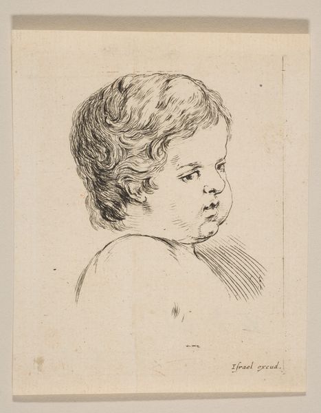 Curator: Standing before us, we have Rembrandt van Rijn's "Portrait of a Boy, in Profile," dating back to 1641. It's an engraving rendered in ink on paper, held at the SMK in Copenhagen. Editor: My first thought is quiet melancholy, you know? He’s caught in this liminal space, a boy but dressed… so formally. There's almost a haunting delicacy to those etched lines. Curator: Indeed, Rembrandt was a master of etching. Examining his process reveals much; notice the density of lines to create shadows and form. The material—ink and paper—belies the complex social structure embedding portraiture production. Editor: Yes, and what social performance *is* this child enacting, right? Dressed up with this incredible lace collar, so starched-looking… Is he comfortable, is he playing dress-up? I get such a performative feeling from him. Curator: Absolutely. The context of the Dutch Golden Age is key here. Rising merchant classes commissioned portraits as a means of asserting status. Children became important vehicles to visualize that societal ascent and lineage. Editor: Lineage! It strikes me, looking closely, how incredibly mature his gaze is. All this fine etching making a child who looks like they know things. Things maybe a child shouldn't? And he knows *he* is being observed for future "productivity." Curator: Rembrandt's economy within means, the controlled marks and his tonal range with only line and space; consider that the etching plates demanded time and money to produce. Printmaking enabled Rembrandt to broadly distribute his artistry—while navigating market dynamics and workshop models in 17th-century Amsterdam. Editor: You make me think that the actual labor in creating the artwork has its impact in what the "narrative" of this kid becomes in history, an artifact in itself of both his childhood *and* Rembrandt’s studio. Something both tender and unsettling in that. Curator: Precisely. Seeing both the artist and his era in this portrait is crucial for contextual understanding. Editor: Thinking of Rembrandt through the image itself... I might have looked at him in galleries differently had I stopped to remember portraits involve *real* children whose realities intersected directly with artistic and socioeconomic circumstances. Curator: A poignant way to consider its place in our collection.