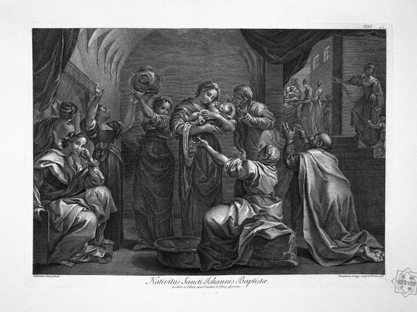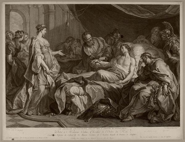 Curator: Jacques Firmin Beauvarlet's "The Fainting of Esther" captivates with its dramatic composition. Editor: The sheer distress is palpable. The composition seems meticulously designed to amplify Esther's vulnerability. Curator: Indeed. As a printmaker, Beauvarlet skillfully uses the engraving process to render the scene's textures, from the rich fabrics to the imposing architecture. Consider the labor involved in creating such detail. Editor: Precisely. And in thinking about that labor, one can't help but consider the power dynamics at play in this biblical narrative. Esther, a Jewish woman, risks her life to advocate for her people. Her fainting becomes a powerful symbol of resistance and female agency, challenging patriarchal structures within the court. Curator: Certainly, the materiality and the means of production directly affect our interpretation of the subject. The printmaking enabled wider dissemination of this narrative. Editor: Absolutely. Looking at "The Fainting of Esther" reminds us how art can reflect and challenge societal norms and power structures. Curator: I agree. The printmaking process and the subject come together beautifully. Editor: A moment suspended, pregnant with potential.