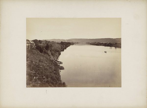 Editor: Here we have Samuel Bourne's "Gezicht op de Marble Rocks aan de Narmadarivier nabij Jabalpur, India", created between 1863 and 1870. The daguerreotype captures this amazing Indian landscape... it feels so serene and still. The water's reflection creates such a symmetrical composition. How do you interpret this work? Curator: The allure, I believe, rests upon the photographic object's self-referential properties. Observe how Bourne crafts an image deeply rooted in the formal aspects of light and texture. The tonality, primarily monochrome, emphasizes the geological structure—the marble rocks themselves—creating a textural dialectic between rough stone and smooth water. It begs a question: does this aesthetic emphasis displace its representational value? Editor: I hadn't considered that tension. I was so drawn to the visual symmetry...the balance in the composition felt like the focal point. Is it primarily about how he used light to draw attention to the rocks? Curator: Precisely. Bourne uses light as a compositional tool. Light, by its nature, highlights shape and three-dimensionality. Also, reflect upon the horizontal orientation; note how it elongates the river's course and draws one's vision deeper into the pictorial space, thus manipulating spatial comprehension and visual tempo within the frame. Editor: So, the form itself communicates as much as, or perhaps more than, the subject? Curator: Precisely. Form transcends the factual depiction of the location itself. The work becomes less about 'where' and much more about 'how' we see, and how the visual language manipulates spatial perception. Editor: I see! Looking closely at the texture of the rock and how the reflection sits perfectly on the water…it gives this picture a different story entirely! Curator: Indeed. It compels a reconsideration of photographic image not merely as a document but as a complex construct.
