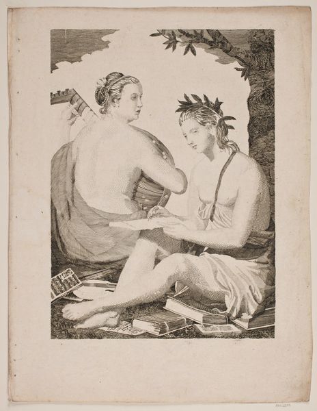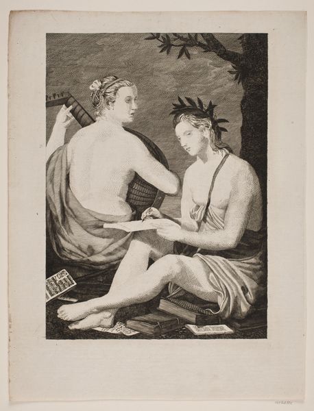 Jan Saenredam's "Vertumnus and Pomona," made around 1600, is a masterclass in engraving, showcasing form through line. The composition centres on the intertwined figures of Vertumnus and Pomona, set against a dense background of foliage. The stark contrast between light and shadow, achieved through intricate cross-hatching, defines the musculature and drapery. Saenredam's expert use of line to create volume and texture draws your eye to the sensuality of the figures. This work exemplifies how printmaking can transform mythological narratives into studies of human form and emotional depth. The detailed rendering of the bodies and the dynamic use of light suggest an engagement with classical ideals. Yet, the detailed naturalism—seen in the carefully observed fruits and foliage—hints at a shift towards a more empirical approach. Notice how the careful arrangement of light and shadow not only models the figures but also contributes to the symbolic weight of the scene, inviting us to consider themes of transformation and desire.