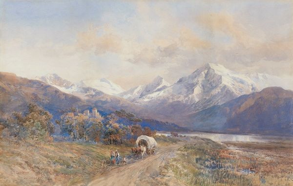 Edward Theodore Compton created this watercolour landscape, "Blick auf Klagenfurt vor den Bergzügen der Karawanken," sometime between 1849 and 1921. The composition is structured by a sweeping vista that leads the eye from the foreground's textured hillside, down through the verdant valley, to the distant, snow-capped Karawanken mountain range. Compton’s use of watercolour lends the scene a hazy atmosphere. The subdued palette of greens, browns, and blues works in tandem with the atmospheric perspective to create a sense of depth. The two slender trees in the foreground serve as both a repoussoir device, framing the scene, and a structural element, their verticality contrasting with the horizontal expanse of the valley. The artwork engages with the picturesque tradition, framing nature as a harmonious and visually pleasing scene. Yet, through its detailed rendering of topographical features, the painting also speaks to a scientific impulse to document and classify the natural world. In doing so, Compton invites us to consider the relationship between observation and artistic interpretation.