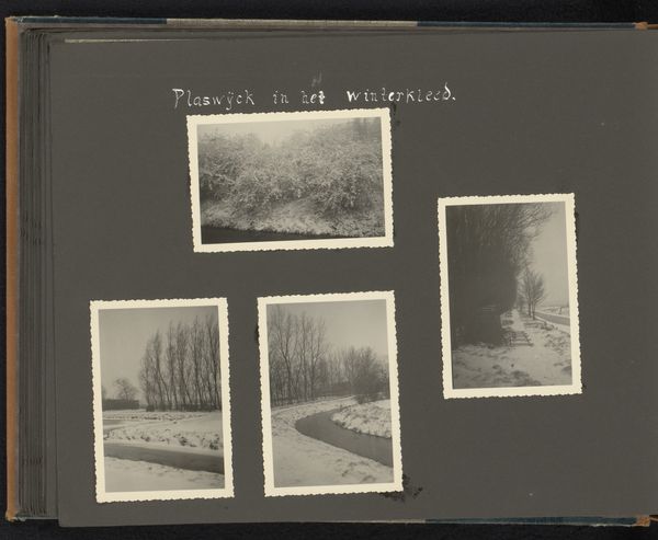 Curator: Herman Besselaar gifted us "Gezichten op Rotterdam en de hond Bessie" ("Views of Rotterdam and Bessie the Dog"), created in 1939. It's an albumen print, a compilation of six snapshots on a single page. My immediate thought is that it evokes a particular, bittersweet kind of quietude, almost haunting. Editor: That quietude speaks to me too. It's the kind of melancholic calm right before upheaval. Consider the historical context: 1939, the brink of World War II. Cityscapes always hold a complex story of society and social structures. Curator: Exactly. Even the presence of Bessie, that inquisitive little terrier in two of the images, enhances the everyday quality but with a touch of endearment. Those glimpses are small gestures towards resilience, capturing ordinary moments that are poignant precisely because of their context. The way the artist juxtaposes landscape with architecture. Editor: Absolutely. There's a dialogue here between the natural world and the built environment. Notice the industrial forms on the horizon – factories and such. Besselaar documents both a pastoral serenity and encroaching urbanization, a visual tension reflecting broader social anxieties. The image speaks volumes about pre-war Netherlands, but not in a celebratory manner. It’s contemplative, even elegiac. Curator: It feels so personal, and yet simultaneously touches on universal themes. The way light plays on the water, it reminds me of simpler times and how that affects me today. It almost gives you a space for imaginative projection. Rotterdam, usually such a bustling port city, feels almost dreamlike in these fragments. The photos are all carefully arranged – he created some sort of harmony here that makes it easier for me to experience. Editor: And consider the dog itself. Why place it there with the Rotterdame views, even including two shots? The artist subtly humanizes a landscape undergoing monumental changes. Our animal friends and the environment is what endures no matter what happens to societal powers, as nature is indifferent, it offers us companionship without strings attached. In its silence, this albumen print holds space for narratives of resilience and reflection, beckoning us to engage with its layered meanings, while offering gentle beauty. Curator: You're right, its silence becomes incredibly potent. Like holding a fragile memory in your hands, or like a snapshot in time which shows history and the way humanity copes. Editor: Exactly. The more that has happened, the more important remembering the ordinary beauty and resilience is.