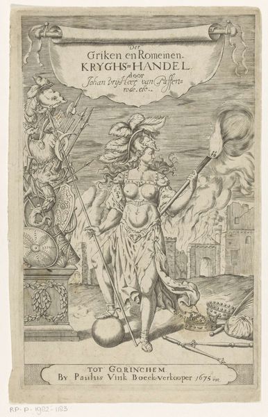 Curator: This is "Title Page" by Romeyn de Hooghe, a Dutch artist born in 1645. It's a delicate etching, measuring just 18 by 11 centimeters. Editor: The composition feels quite theatrical, almost staged. Very dramatic use of light and shadow, and those figures! What do you see there? Curator: Well, the central figures clearly embody War and Peace, with Justice hovering above. I'm interested in de Hooghe's skill in deploying etching techniques here. Editor: Look at the figures at the base too, the allegorical figures are so telling; the wolf, representing savagery, is subdued. It's a powerful statement on the desire for order. Curator: Etching allowed for detailed lines and tonal variation, achieved through acid-resistant coatings on the metal plate, it's quite impressive. Editor: The scales of Justice, the weapons of War... they are timeless symbols that resonate even today. I wonder what contemporary viewers made of it? Curator: Considering the materials and the printing press, it’s fascinating how such intricate details became accessible on a wider scale. It shows how art, even then, was tied to distribution. Editor: Yes, seeing how de Hooghe used established symbols in a new context offers a window into the culture of the time. Curator: And for me, it underscores the importance of the material conditions that made such widespread dissemination possible. Editor: A potent combination of artistry and symbolism that still speaks to us across the centuries.