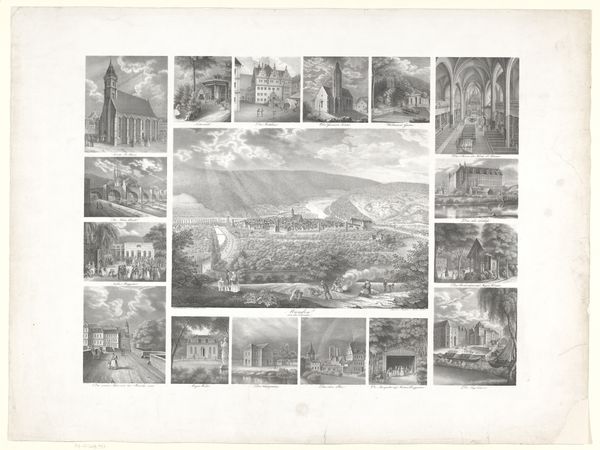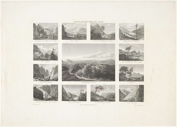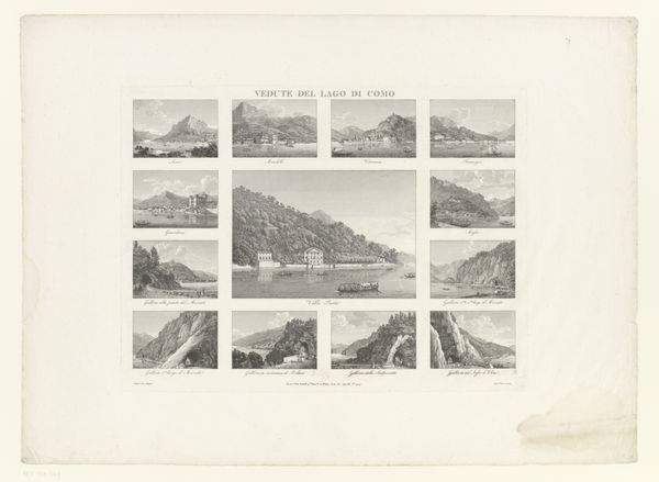 Curator: This is "Vedute del Lago di Como," a print dated from 1794 to 1830, housed right here at the Rijksmuseum. What strikes you about it? Editor: Initially, the compartmentalization. It feels like a set of postcards from a grand tour, neatly arranged. The grayscale palette adds a certain austerity, a calculated detachment from the landscape's inherent beauty. Curator: Precisely. The very title, "Vedute," or "views," aligns it with the Italian tradition of precise, almost cartographic landscape art that flourished in the 18th and 19th centuries, fueled by the rise of tourism and a desire to capture and possess picturesque locations. Think of Canaletto's Venice. Editor: The composition in each small engraving reinforces this idea. There's a clear foreground, middle ground, and background, each carefully delineated. Note how geometric architectural forms are interspersed amongst them, suggesting human dominance over nature, quite characteristic of Neoclassical aesthetics. Curator: Absolutely. The geometric element reflects that same era's emphasis on order and rationality. Churches and villas are positioned within the landscape, symbolizing control, wealth and an appreciation of 'sublime' beauty found in cultivated nature. Each of these elements subtly echoes cultural ideals prevalent at that time. These were potent signifiers for the artwork's intended audience. Editor: Are you suggesting it served as a souvenir, more than, perhaps, a meditation on place? Curator: In part, yes. It's both a memory object and a symbolic declaration. Lake Como, framed and tamed, reflecting a sensibility deeply rooted in its era. A demonstration of both aesthetic and actual access. Editor: Well, framed by that historical lens, I can better appreciate its layers. Initially, its reserve felt… well, reserved. Now I read it as a very curated expression of a specific time and class. Curator: The landscape contains encoded ideas, and once deciphered, it provides a more resonant echo of the past. Editor: I suppose that opens the view quite considerably.