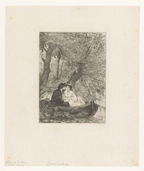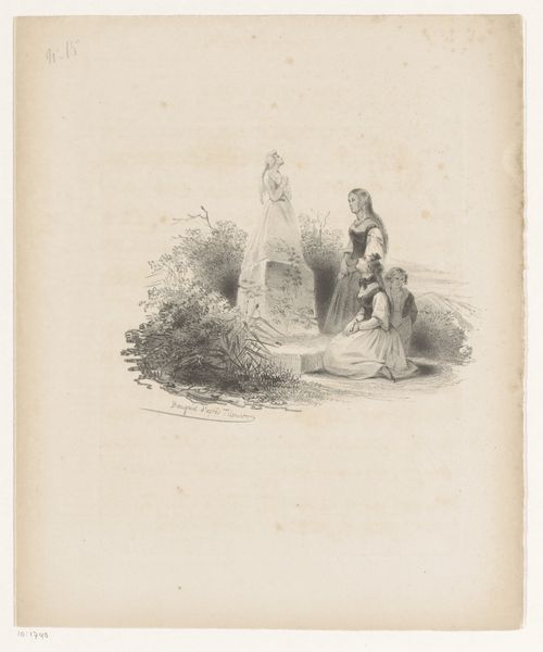 Paul Gavarni made this lithograph, "Woman with a sick lover on a bench in a garden," sometime in the mid-19th century. Gavarni specialized in scenes of Parisian life, often depicting the lives of the working class and the marginalized. Here, we see a departure from the usual bustling city streets. A woman tenderly supports a sickly man in what appears to be a private garden. The image is imbued with a sense of intimacy and melancholy. Gavarni's choice to set the scene in a garden, a space typically associated with leisure and affluence, hints at a critique of the social conditions of the time. The man's illness, juxtaposed with the idyllic setting, underscores the vulnerability of human life, regardless of social standing. To fully understand Gavarni’s work, we might explore the periodicals and journals where his lithographs were originally published. Such research would allow us to better situate his images within the broader social and cultural debates of his time. Art like this reminds us that its meaning is always rooted in a specific historical context.