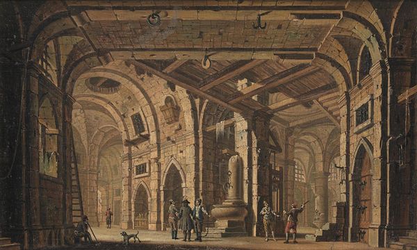 Editor: Here we have "Church Interior," an oil on canvas piece by Bartholomeus van Bassen, dating approximately 1530 to 1630. The sheer scale and the intricate geometric patterns of the floor are immediately striking. What structural elements do you find most compelling? Curator: The receding perspective is the foundation of this composition, wouldn't you agree? Note how van Bassen meticulously orchestrates a complex interplay of vertical columns and arched forms to create an illusion of infinite depth, adhering to principles established by Alberti. The architectural details, though perhaps not entirely accurate, serve as formal devices to guide the eye. Editor: Yes, the use of perspective is undeniable! What about the lighting? It seems quite uniform. Curator: Precisely! The consistent illumination reduces shadows and minimizes dramatic contrasts. Instead of directing focus, light distributes visual weight throughout the picture plane. Observe how this evenness impacts the overall perception of space, rendering it less about immediate presence and more about constructed order. This flattening can be further analysed via a careful consideration of depth cues. Editor: So, the point isn't about worshipping in the church, but about contemplating this idea of geometrically ideal space. Curator: That's right! The figures are diminished, functioning merely as structural counterpoints that further underscore the vastness of the setting. In that sense, we are invited not to engage with narrative, but with pure form. Van Bassen thus masterfully abstracts a space into an exploration of aesthetic formalism. Editor: I see now how prioritizing architectural elements diminishes the narrative aspects and promotes the formal quality. Curator: Yes, through that balance, the work shows how form can reveal underlying, more important relationships and themes in art.