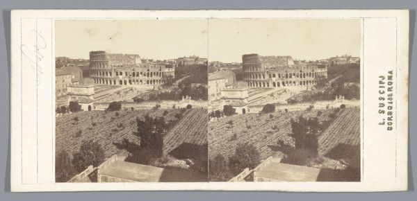 Editor: This is a stereograph from sometime between 1862 and 1876 by Jean Andrieu, called "Interior of the Colosseum in Rome." It's a photograph, a gelatin silver print. The sepia tones give it such an aged, almost haunting, quality. What strikes you most about this image? Curator: It’s compelling to consider the image through the lens of power and its decay. The Colosseum, a site of grand spectacle and brutal violence under the Roman Empire, is presented here as a ruin. What does it mean to capture this arena, once filled with the roar of the crowd and the suffering of gladiators and animals, now silent and empty? Editor: So, it's not just a picture of an old building? Curator: Absolutely not. Andrieu's photograph invites us to reflect on how civilizations rise and fall, how structures of power crumble over time. Think about who had access to this space, both during its active years and during the time this photo was taken. Who benefited, who suffered, and whose stories are told—or not told—within these walls? Editor: I never really thought about who it excluded. Curator: Exactly! This wasn't a democratic space, nor is its representation here neutral. Consider how the photograph might romanticize or sanitize a history built on exploitation and oppression. We should ask ourselves what purpose such images served for those who viewed them in the 19th century, especially within the context of European colonialism. Editor: It sounds like even a landscape can be a political statement. Curator: Indeed. Examining this photograph challenges us to think critically about the narratives we inherit and the ways in which images can perpetuate or disrupt dominant ideologies. Seeing the past through the lens of the present lets us question and reimagine its potential futures. Editor: I'll definitely look at photographs differently from now on. Thanks for your insight!