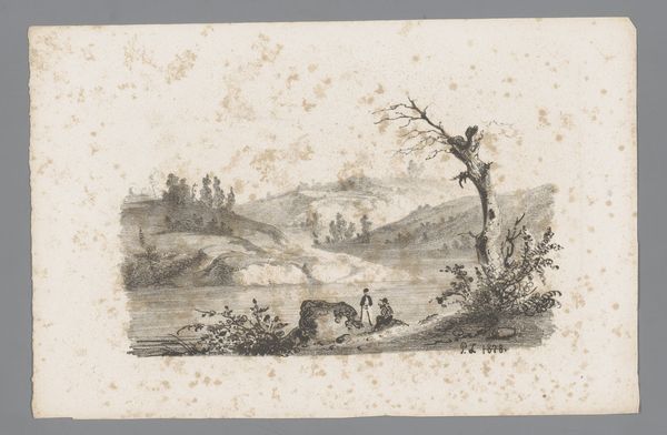 Curator: This is Paulus Lauters' "Landschap met figuren bij een rots," a drawing rendered in pencil. It's believed to have been created sometime between 1827 and 1851. It now resides in the Rijksmuseum. Editor: Immediately, the towering rock formation, this imposing cliff-face, grabs the attention. It seems almost like a natural cathedral, doesn't it? Quite dramatic given the restrained pencil work. Curator: Yes, Lauters’ skill with pencil allows for very fine detail. Look at the varying pressure he uses to suggest texture – the roughness of the rocks against the softness of the foliage. It speaks to an understanding of the natural processes that shaped this environment. I see the legacy of artisanal knowledge too. Editor: And the figures... tiny, almost incidental, grouped at the base. They enhance that feeling of awe, reminding me of Romanticism's fascination with the sublime power of nature, dwarfing human existence. Curator: The location probably mattered a great deal. The 19th century witnessed an increased public interest in accessing and experiencing landscapes directly, a social phenomenon supported by innovations in infrastructure. Think of how the railroad opened remote picturesque locations to larger crowds. This work is evidence of this type of material shift, I think. Editor: Certainly. But that rock, to me, echoes centuries of artistic and literary symbolism. It feels biblical, like the rock from which Moses struck water or a protective shelter. Rocks offer that kind of emotional resonance – safety, permanence, perhaps even a hint of the spiritual. Curator: A romantic perspective would say it stands as an obstacle against change; an appeal to tradition. Editor: Precisely, but the scale of the thing is interesting, the way the whole composition pulls you in to contemplate nature and history together. Curator: Looking closer, it strikes me how deftly he achieves depth. Not just through perspective but through the subtle gradations of light and shadow achieved with such a limited medium. The man power! Editor: For me, I keep coming back to that contrast: the detailed naturalism versus that evocative, almost primordial symbolism. There’s a lot packed into such a seemingly simple drawing. Curator: I agree. Thank you. Examining it through your interpretive lens really underscores that fact. Editor: The pleasure was mine, offering a glance into the hidden lives of symbolic meaning.