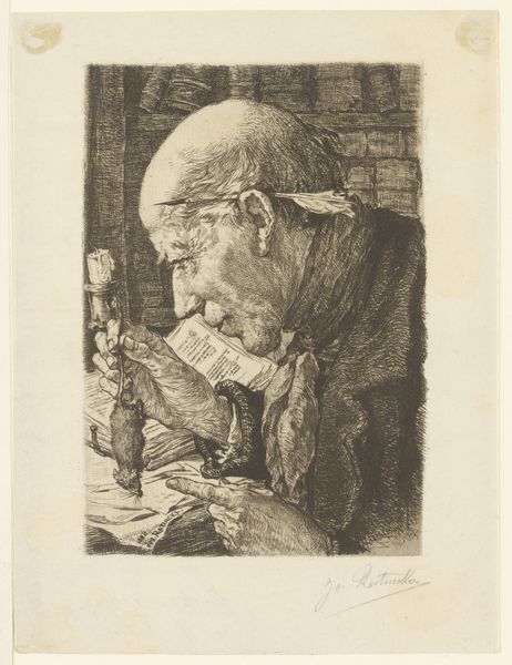 Editor: This is "Head of a Downward-Looking Bearded Old Man" by Auguste Danse, created in 1897. It's a graphite drawing, and also appears to incorporate etching and print techniques. I’m immediately struck by the intense downward gaze; there’s a feeling of contemplation or perhaps even sadness. What do you see in this piece? Curator: Indeed. Consider the gaze, a consistent symbol across millennia, directing our attention. The downward glance has long signified humility, introspection, even repentance. But observe how Danse avoids cliché. This isn’t simple contrition; the man's brow is furrowed, the mouth subtly pursed. Is he remembering? Reflecting? What cultural memory might he carry? Editor: So, you're saying it’s not just a literal depiction but symbolic? The way he’s drawn is not random? Curator: Precisely. The beard, meticulously rendered, signals wisdom accumulated with age. It acts as a visual link connecting him to prophets, patriarchs, sages— archetypes embedded deeply within our collective unconscious. Danse is evoking a lineage of knowledge. Does that resonate with you? Editor: Definitely. I hadn’t thought of it that way. So, the image isn't just a portrait, but a coded message about age, experience and, cultural memory. Curator: The symbolism speaks across time. The “old man” often serves as a symbol for the trials and burdens, representing collective experience. Don’t you see him representing humanity? Editor: I do now! This makes me look at portraits and the way they symbolically reference archetypes through certain angles and elements. Thanks! Curator: Indeed. Reflecting upon cultural memory helps unlock powerful layers of meaning!
