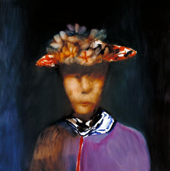 Editor: Here we have Stefan Caltia’s oil on canvas, "Girl With Crown," created in 2005. I'm immediately struck by the somber mood despite the crown of greenery, and the unsettlingly pale skin of the figure. How do you interpret the narrative being presented? Curator: That unsettling feeling, I think, is key. Caltia is consciously playing with portraiture traditions but subverting them. He presents us with a child in almost ceremonial attire, but there's a palpable sense of unease. Do you notice how the dark, almost abstract, background looms over her? Editor: Yes, it almost feels like a shadow or a looming presence. Curator: Exactly. And that stark contrast between the pristine white dress and the shadowy background speaks to a tension present within the social construct of innocence. This girl isn't necessarily *innocent*; rather, she is *performing* it. Caltia is hinting at the ways societal expectations burden and confine, particularly on young women. The "crown" itself is not bejeweled, as we would imagine for royalty. The wreath suggests connection to nature, perhaps naiveté. But doesn’t the stark presentation feel staged? Editor: It really does. So, you’re saying he's using the visual language of portraiture to critique those power structures? Curator: Precisely. Think about who traditionally gets their portrait painted and why. Caltia, in a contemporary context, flips that on its head by giving us this vulnerable yet unnerving subject. Editor: That's fascinating. I initially saw it as a fairly straightforward portrait, but the historical and social layers you’ve pointed out give it a whole new dimension. Curator: Art often reflects the anxieties of its time. Looking at Caltia’s work through that lens reveals a much richer and more complex narrative than what meets the eye.