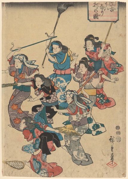 Shibata Zeshin, active during the late Edo and early Meiji periods, created this colorful print titled "A comic pursuit of ladies" using woodblock printing techniques. This image offers a glimpse into the lives of women during a period of significant cultural and political change in Japan. Zeshin, who was born into a society with rigid social hierarchies, may be offering a subtle commentary on the roles and expectations of women in his time. We see women engaged in cultural activities – playing music, reading, and creating art. These pursuits, traditionally associated with refinement and leisure, provide insight into the identities of upper-class women and their creative and intellectual lives. The gathering of women suggests a sense of community and shared experience. The 'comic' element of the artwork is likely found in the subversion of traditional depictions of women. Zeshin perhaps encourages viewers to consider the diverse experiences and individual identities of women beyond their expected societal roles. Zeshin invites us to reflect on the complexities of gender, class, and cultural identity during a transformative period in Japanese history.