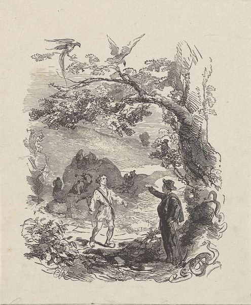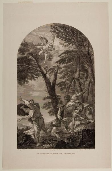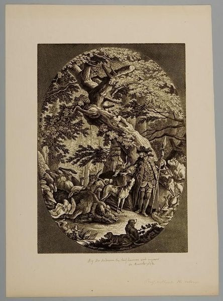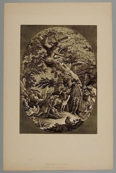 Curator: What strikes me immediately is the stillness amidst the aftermath of the hunt. Editor: Indeed. This is "Returning from a Boar Hunt" by Alexander Anderson, who lived from 1775 to 1870. The print captures a scene filled with laden symbolism. Curator: There’s a deep contrast between the regal hunter and the subdued animals; it reflects humanity’s dominance over the natural world. The boar itself is a potent symbol of untamed forces. Editor: I see the composition as hinting at the costs of that dominance. The hunter may stand triumphant, but look at the exhaustion in his pose and the carnage surrounding him. Curator: It is a brutal dance, showing the intertwined roles of humans and nature. Editor: The image really gives a lot to consider.