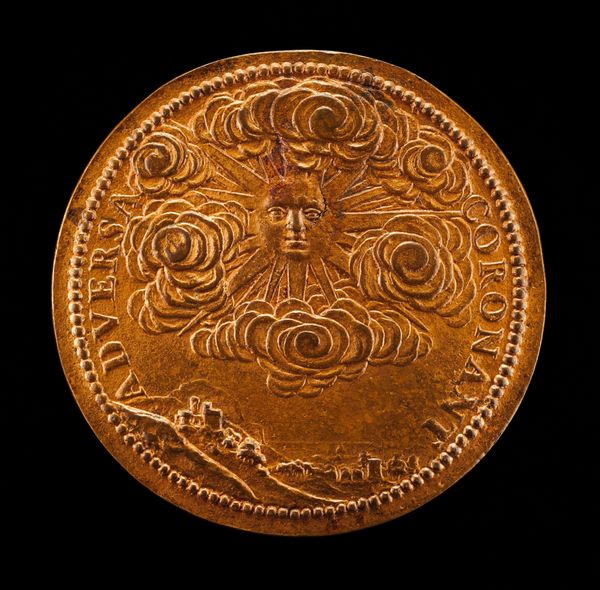 Curator: So, here we are in front of this enigmatic bronze medal, "Sun Shining on a Stormy Sea [reverse]", created after 1559 by Pier Paolo Galeotti. Editor: It’s incredibly detailed for such a small object! I'm struck by how the artist managed to convey both chaos and tranquility within the same circular frame. The sun's rays and turbulent waves... What do you make of this piece? Curator: It feels like an intimate conversation between light and water, doesn't it? A struggle perhaps. Imagine Galeotti, a sculptor by trade, painstakingly carving this relief. I suspect it is much more than an aesthetic exercise. What stories of resilience, of hope battling despair, might be embedded within it? Do you notice how the inscription wraps around the drama like a whispered secret? Editor: Yes, "NVNOVAM SIC[C] ABITVR ESTIV," it looks like Latin... "The summer heat will dissipate". How fascinating. Curator: Perhaps reflecting the shifting political climates of the time, or more personally, a testament to navigating life's inevitable storms. The Renaissance was such a melting pot of ideas. This reminds us that even what seems small and contained can hold immense meaning. What personal connections do you have with this idea? Editor: It’s empowering to realize something so small could reflect monumental struggles! It makes me think of my own… creative battles. Curator: There you have it! We can draw wisdom from a 16th-century bronze medal. Editor: Totally, a beautiful, and ultimately, hopeful, object!