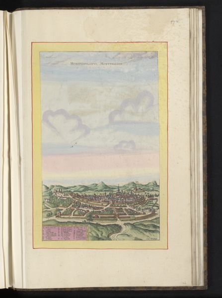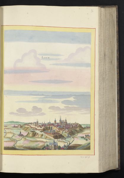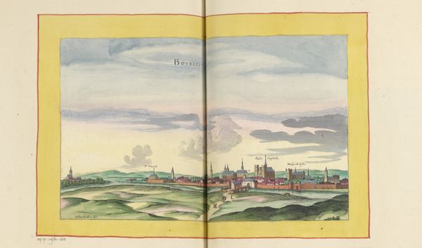 Editor: This is Matthäus Merian's "Gezicht op het kasteel en de vesting van Coucy," created in 1655 with watercolor on paper. I'm struck by its sense of distance. The walled city looks so far away, almost dreamlike against the pastel sky. How do you interpret this work? Curator: This cityscape, made with watercolors on paper, invites us to consider power and representation in 17th-century Europe. Merian isn't just showing us a castle; he's showcasing a symbol of authority at a time of significant political and social upheaval. Look closely at the meticulous detail in the fortifications—what message do you think that conveys to the viewer, especially considering the role of cityscapes in projecting a particular image of the city and, by extension, its rulers? Editor: I see. The detail emphasizes the strength and control the ruling power has over the landscape. It almost feels like propaganda. Is that a fair assessment? Curator: Precisely! Consider how these images circulated and the audience they were intended for. Were they meant to impress foreign dignitaries, reassure local populations, or serve some other purpose tied to the maintenance of power? What is omitted from the image is equally important to explore, no mention of those subjugated or oppressed. By unpacking this, we can start to see how art functioned within broader systems of control. Editor: That's a powerful point. It shifts the focus from simply admiring the aesthetics to understanding the artwork's role in shaping social narratives. I will think of that from now on. Curator: Exactly. By engaging critically with art history, we expose both explicit and tacit messages within artworks and unpack power relations.