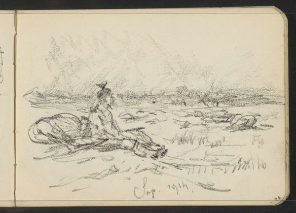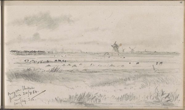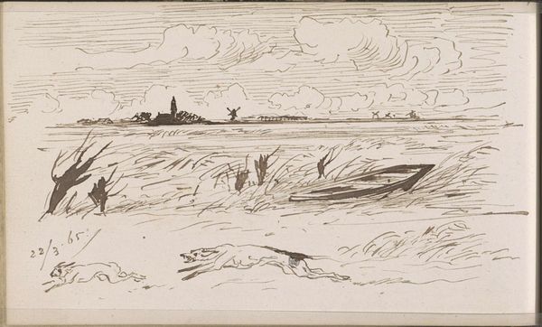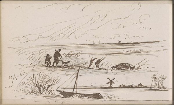Curator: The first impression I get from Johannes Tavenraat’s ink drawing "Landscape with Figures Pulling a Rowing Boat to Shore" is one of stark, windswept labor. It's dated 1865 and currently held in the collection of the Rijksmuseum. Editor: I see figures engaged in labor but also notice the tension between representation and the artistic process itself. What does the act of drawing, the choices of ink and paper, tell us about the artist’s understanding, or even romanticizing, of labor? Curator: Tavenraat seems to focus more on accurately capturing the physical strain involved, down to the posture of each figure. Look at the way the figures are interacting with the landscape, their hands grasping ropes attached to the boat; you can almost feel the weight and drag. It suggests a direct engagement with the materiality of work. Editor: Precisely. Realism emerged alongside the rise of industrial capitalism, offering representations of the working class and their relationship to production. But what about those with power depicted? What about class relationships and how they shaped access to resources and determined these people's labor? Curator: Well, think about what this scene omits. The actual process of fishing, for example, is missing; what is being made available here is work as tangible labor rather than its economic endpoint, drawing focus to its physicality rather than any commodity produced. The medium itself lends to this, as an ink drawing is an easily reproducible method, like these workers themselves who are doing work. Editor: Yes, but it’s important to acknowledge the art market in this. An artwork portraying the working class, like this, gets sold and possessed by wealthy patrons. Are these figures being displayed without critique? This makes it a social statement regarding inequality. Curator: But this level of detail feels inherently respectful of the labor performed, and it avoids aestheticizing it into something falsely idyllic. He seems concerned with the here and now of the task at hand, trying to faithfully represent its textures. It makes me wonder, what inks were available at the time, what supports might he use, who sold them, who were his art making peers and contemporaries? Editor: A powerful and important consideration to ensure these scenes continue to receive their due attention and remain subject to robust analyses about artistic intent and contemporary social forces.
