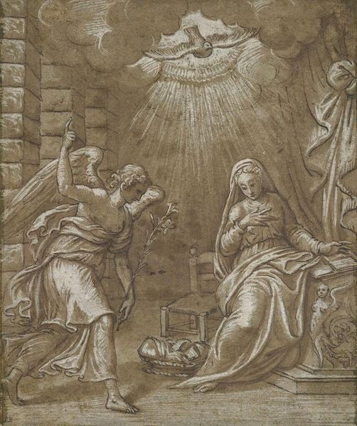 Curator: This is Jacques Callot's "Holy Family with Saint John," a small but intricate engraving dating back to the early 17th century. Editor: It's like stepping into a dream! The delicate lines create this ethereal, otherworldly glow. It feels very intimate, despite the formal subject. Curator: Callot was a master of printmaking, and the piece reflects the Catholic Counter-Reformation and its emphasis on piety and the Holy Family as a domestic ideal. It reinforces the importance of faith amid social change. Editor: I get that. But I'm also struck by the humanity—the softness in Mary's gaze, the way the children reach for each other. It makes the divine seem so accessible. Curator: Yes, and the inclusion of Saint John highlights the importance of lineage and prophecy. These religious and patriarchal narratives should also invite critique, no? Editor: Absolutely! But for me, it’s a reminder of how artists can imbue even the most rigid structures with genuine emotion. Thanks for letting me see it that way.