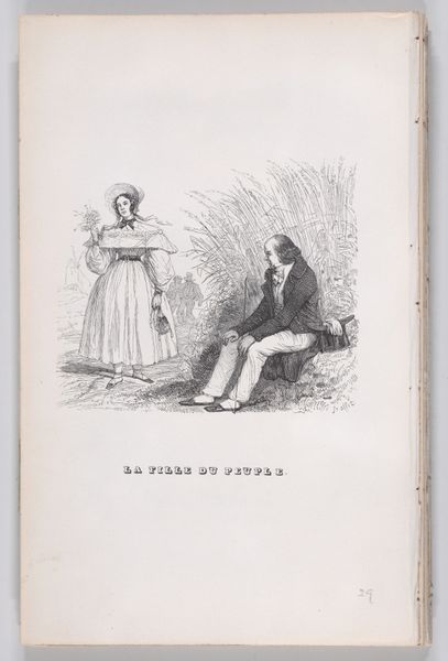 Curator: Today we’re looking at an etching by J.J. Grandville, dating from 1836. It's titled "Jeanne, the Redhead" from The Complete Works of Béranger, and it’s a piece currently held at The Metropolitan Museum of Art. Editor: What strikes me immediately is the weight in this image, both literally and figuratively. You see this woman, likely a mother, burdened with children, and you sense a deep story of survival embedded in that weight. Curator: Grandville made this print as one of many illustrations for a collection of songs by Béranger. Etchings like this one, made with ink on paper, would have allowed these images to be mass-produced alongside the sheet music. The materials themselves enabled wider cultural dissemination of both image and song. Editor: I am so interested in that distant figure looming in the background, almost a spectre. He appears to be a soldier. It adds an air of historical context— perhaps reflecting social anxieties or realities tied to war or conscription. He’s a very imposing symbol. Curator: Absolutely, the technical execution in the etching allowed Grandville to render that detail, like the soldier and even the scattered leaves, quite sharply. He achieves various tones and textures using a dense network of lines. You can see the meticulous craftsmanship. The reproductive processes employed in printmaking during this period speak volumes about industrial changes affecting art production, no? Editor: And speaking of those scattered leaves, observe how they frame her feet as she strides forward, seemingly in motion, despite being in an outdoor setting. Their placement reminds me of the frailty of life and how all living beings weather through challenges over time. What visual metaphor. Curator: Yes, the landscape seems to reflect the woman’s state; it isn’t a serene or idealized natural setting. We see, again, evidence of process and the labor inherent not just in this etching but the circumstances surrounding the subject herself. Editor: It truly is evocative— I appreciate now how both artistic technique and symbolism blend into this emotionally rich snapshot of a moment. Curator: Exactly, considering all that, it seems a worthy thing to pause and examine even further.