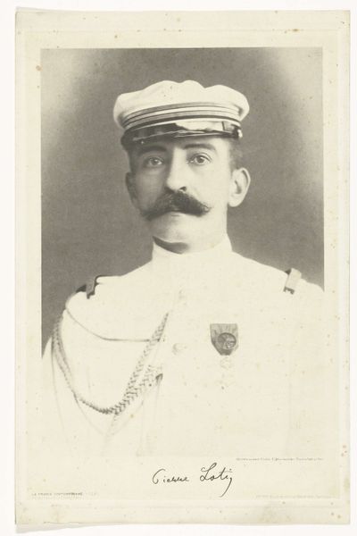 Curator: Here we have Ferdinand Robert Ebner’s gelatin-silver print, "Portret van Toto van Heemstra," created sometime between 1880 and 1920. It’s quite a striking portrait. Editor: It feels… weighted down. The figure is adorned, almost buried, under layers of regalia. I find myself immediately questioning the purpose of such elaborate displays of power. Curator: Indeed. Focusing on the visual elements, one cannot ignore the density of textures. The smooth, almost porcelain skin of the subject sharply contrasts with the intricate braiding and tassels of the uniform. The arrangement creates an interesting juxtaposition of softness and rigid ornamentation. Editor: And let’s not ignore the historical context. These displays of military might served a clear purpose. Imperialism demanded these visual assertions of dominance, a performance of unwavering authority crafted to intimidate both domestic populations and colonized subjects. It’s a loaded image. Curator: I see your point, but from a purely formal perspective, the light and shadow play across the different planes is captivating. Ebner clearly understood how to use light to create depth and volume within the limitations of early photography. The diagonal lines of the sashes, the careful rendering of each braid…it all speaks to a keen understanding of pictorial space. Editor: Agreed, there is technical skill evident. But I cannot separate this skill from the purpose it serves. Photography, particularly portraiture of this kind, became a powerful tool in solidifying existing power structures. Who was this “Toto van Heemstra” and what role did he play in upholding those structures? These are critical questions to ask. Curator: Perhaps, but let’s also consider the aesthetic value achieved through contrast, texture, and tonal variation. This print invites us to analyze the mechanics of image construction. The use of realism invites viewers to explore both internal and external elements such as lighting, framing, detail and social representation. Editor: Fair enough, yet ignoring the ideological underpinnings would be irresponsible. The very act of memorializing this man in such a manner reinforced and legitimized his place within a hierarchical system that privileged certain identities and actively oppressed others. Curator: A somber point, and an important layer in the interpretation of Ebner’s compelling photograph. Editor: Indeed, hopefully one that moves us to question these power dynamics that still reverberate today.