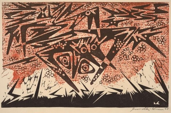 Curator: This vivid linocut print, "Rising and Sinking Sun," is attributed to Karl Schrag, although it's difficult to place an exact date on its creation. Its abstract nature allows us a multitude of interpretations, don't you think? Editor: Absolutely. My immediate impression is one of primal energy. The bold red against the yellow is quite striking, almost violent in its simplicity. There's a definite tension created by the duality of rising and sinking, a sort of push and pull between creation and destruction. Curator: I find myself drawn to the symbolism here. The sun, of course, represents life, energy, and power across countless cultures. But Schrag's choice to depict it simultaneously rising and setting introduces an element of cyclical time, the ever-turning wheel of existence. What cultural weight do you believe that has, if any? Editor: It feels incredibly relevant right now, actually. Consider the historical moment, or any moment really!— of empires rising and falling, social movements gaining and losing momentum... the sun embodies all those narratives, too. I read this tension between rising and falling as representing systems or peoples or even the earth herself reaching its own critical mass, on the cusp of evolution. Curator: Yes, but I think it's also important to see the archetypal perspective—consider that the duality within us, the ongoing tension between hope and despair, action and passivity. Schrag captures something fundamental about the human condition, using stark abstract images. There's an enduring quality about it, because that rising and setting cycle exists within us at every moment, like a microcosm. Editor: But is the psychological always separable from the political and social, and vice versa? Even an individual's sense of hope and despair are inherently shaped by power structures. Curator: Maybe they are not. It shows a sort of wholeness. I find something so deeply resonant. I love seeing those archetypes in what appears to be such simple image. Editor: Right. That tension between something both so huge, universal, while feeling like such a miniature scale is something to meditate on in these interesting times. Curator: Indeed. Thanks to Schrag for capturing that essential dialectic with such memorable visuals!
