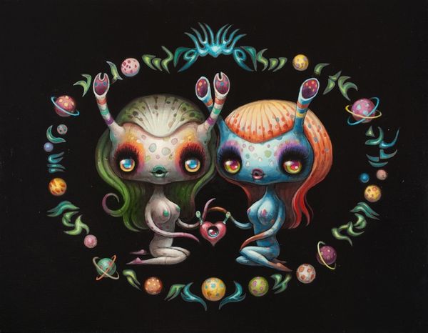 Editor: This is "Girl in the River" by Yoko d'Holbachie, a mixed-media painting that has an eerie yet enchanting vibe. The contrast of the whimsical creature with unsettling details, like the four eyes and the catfish mount, is intriguing. What draws your attention from a formal perspective? Curator: The artist's mastery of chiaroscuro immediately strikes me. Note how the figure and the fish emerge from the oppressive darkness, creating a heightened sense of drama and emphasizing the surreal quality of the composition. The use of complementary colors, specifically the reds and greens in the mermaid-like tail, also serve to amplify the focal point, don't you think? Editor: Absolutely, the tail pops out! What about the overall arrangement of the figures? It seems significant somehow. Curator: Indeed. The artist's compositional choices create a complex dynamic. The small key hanging from the figure's hand creates a clear, near diagonal line from the head that emphasizes its importance in the piece, but also causes the gaze of the viewer to travel, perhaps never quite focusing. What purpose do you ascribe to such ambiguity? Editor: Maybe to keep the viewer wondering? So much about the creature is ambiguous from her multiple eyes, the yellow flower, her place on the strange creature – all things out of our grasp. Curator: Precisely. Consider then, how this work destabilizes traditional notions of portraiture through this very ambiguity. The piece actively invites questioning. Editor: This has truly revealed so much about the art's intentional choices, especially the color and figure placement, that enhances my understanding of its message. Curator: Agreed. The conversation reminds me that formal elements offer a rich gateway to interpreting any art object's core.