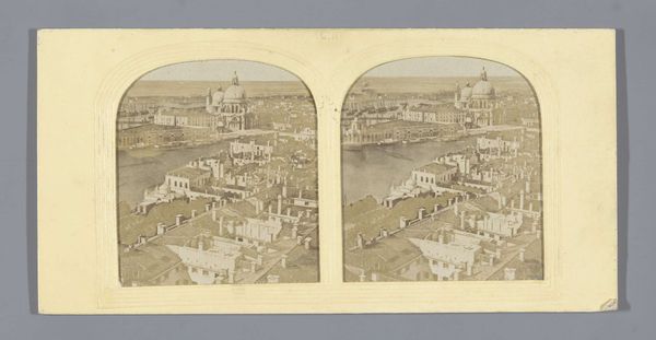 Curator: So, what do you think about this "View of Budapest with the St. Anne Church"? It's an 1868 photograph by Charles Gaudin. It’s a stereoscopic print. Editor: Instantly, I’m struck by how orderly everything looks. Not in a sterile way, but in a balanced, pre-planned, almost architectural way. What about you? Curator: Absolutely! Gaudin had an eye. It's considered a romantic cityscape. It makes you ponder what city life might have been back then. Before our lives became as… fractured. The church really pops though. Editor: Churches often act as central focal points in urban iconography. This Saint Anne church speaks of Baroque aesthetics – the dual spires imply an opening to heaven. The curves remind me of embracing arms, very warm. But there is something of a darker element with all those buildings huddling together... Curator: Interesting! It's funny you say "huddling," as they actually feel sort of imposing and separated to me. Editor: The perspective gives it a condensed feel, all elements forced into the frame. Consider how Gaudin uses light. The higher vantage gives a kind of 'God's eye view.' Almost biblical in presentation, yet deeply embedded with culture, don’t you agree? Curator: I can see it! It makes you think of humanity at its most communal and, if I’m being cynical, also at its most susceptible to dogma. That sounds very modern! Editor: The themes, even viewed today, still evoke something lasting from that particular moment in Budapest. It's as though a memory imprints upon a collective consciousness and then it's immortalized in art. Curator: Yeah, now I see what you meant. It feels timeless. Well, that certainly was something.