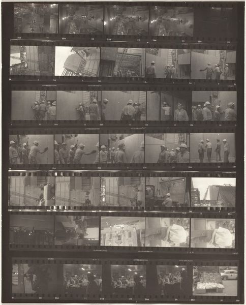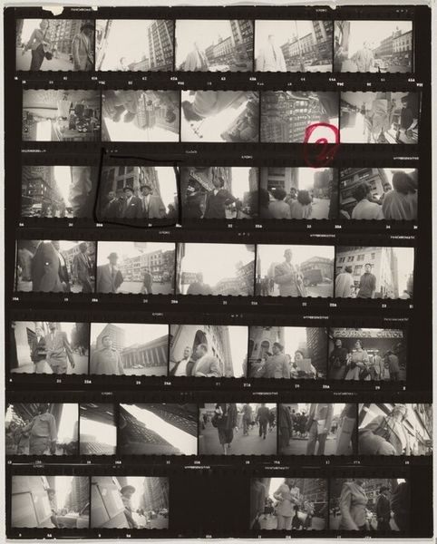 Editor: Today we’re looking at Robert Frank's "Cousin Roger--Paris 6A", a contact print made sometime between 1949 and 1950. It's essentially a sheet of film, showing several different moments. I'm struck by how raw and unfiltered it feels. What aspects of its composition do you find most compelling? Curator: The stark contrast between the images and the dark film around them creates a distinct sense of visual rhythm. The differing focal lengths in each frame demonstrate varied layers of experience. What purpose do you believe the photographer sought to express when arranging the strip into this matrix? Editor: Perhaps the collage structure shows the fragmentary and fleeting nature of street photography and personal memory, similar to the literary techniques developed at the time. I wonder if Frank was intentional about the order or juxtapositions. Curator: Indeed, the arrangement certainly guides our reading. There are numerous high-contrast shots on what we might call an "emotional" plane: rainy cityscapes. Then, on the bottom edge, low contrast, less obviously 'emotional,' scenes. I’m interested in your perspective on his compositional choices regarding line and shadow. Editor: I see how the stark lines and deep shadows create a sense of depth. But what is more intriguing is how the artist makes no effort to disguise the materiality of the strip: we are forced to recognise the 'support' on which the image is displayed. The dark areas are just as critical in contributing to the picture's meaning as the parts in 'positive'. Curator: A keen insight! By drawing attention to the photograph as an object he invites us to consider its nature as something constructed and not purely referential. The work creates its own reality by self-consciously drawing our gaze to the qualities of monochrome print-making. Editor: I appreciate that emphasis on the print itself! This helps us appreciate Frank's process and aesthetic choices.