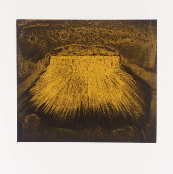 Editor: This untitled print by Anish Kapoor uses intense red and black to create a rather ominous landscape. The shapes feel primal, almost violent. What symbols do you see in this work? Curator: The dominance of red certainly evokes strong emotions. Consider how cultures across time have used red to signify blood, passion, or sacrifice. Do you see that single red dot hovering above? It may represent a lost soul. Editor: A lost soul! I hadn't considered that. It's fascinating how those colors and basic shapes can carry so much cultural weight. Curator: Indeed! It shows how abstract forms can still tap into our collective memory. I've learned something new as well.