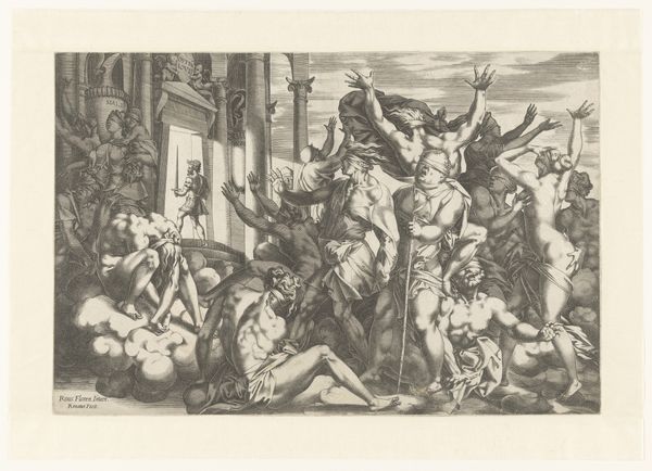 Editor: We’re looking at Jean Chartier's engraving, "Alexander the Great Burning Persepolis," which was created sometime between 1514 and 1580. It’s quite a detailed print. There is something almost dreamlike about it, even with such a destructive scene depicted. What do you see in this piece from a formalist perspective? Curator: Immediately, I am drawn to the artist's sophisticated handling of line and space. Consider the density of the linework within the architectural background versus the relatively sparse rendering of the figures in the foreground. Notice how this contrast creates depth and draws our eye toward the drama unfolding, this burning of Persepolis. Do you observe any other formal devices being employed? Editor: The use of light, perhaps? There's not much tonal variation, but the lightest areas seem to highlight the figures' bodies, almost like a spotlight on their forms. And there's definitely a classical influence, it reminds me of the Renaissance. Curator: Precisely. The figures themselves exemplify a particular ideal of the human form characteristic of the Renaissance, rooted in classical ideals. Further observe the composition—how the figures are arranged and how their poses interact with the architectural space behind them. Do you perceive any dynamic tension or harmony in their arrangement? Editor: It’s kind of both. They seem purposefully posed, a bit stiff maybe, within the chaos of the background. Maybe it creates some symbolic dichotomy. Curator: Perhaps, and note how the artist organizes forms to structure the scene. The geometric rigidity of the architecture contrasts against the dynamism in the foreground. What might that contrast imply? Editor: It shows control within a destruction of structure. It is a unique take that I will remember to consider next time. Curator: A valuable insight. Studying art formally allows us a structured way to address more subjective interpretations.