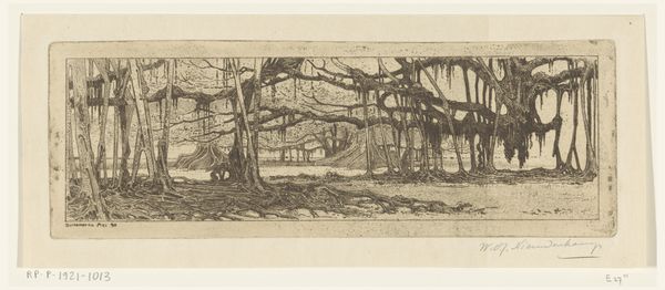 Editor: This is "Gevelde iepen aan de Zuidervesting te Edam," or "Felled Elms on the Southern Bulwark at Edam," an etching done on paper in 1914 by Wijnand Otto Jan Nieuwenkamp. There's such a melancholy stillness about this scene. It really draws you in. What's your perspective on it? Curator: It is poignant, isn’t it? To me, the image hums with echoes. You feel the presence of these once towering trees, felled but still possessing a quiet dignity. The artist clearly has an emotional connection, wouldn't you agree? I love the sinuous lines that feel Art Nouveau but root into the earth. How do you read that visual tension? Editor: I see what you mean! It's like nature reclaiming its own space in the lines of art nouveau. What's also striking is that the tree, the elm, seems to frame the image as it if it’s peering from some hidden part of the forest. Do you think there is some symbolism in play? Curator: Absolutely, symbolism seems baked in. Elms have long stood for strength and resilience, which only makes their fallen state more arresting. It perhaps mirrors the fragility of life, even in the face of enduring beauty. Don’t you find that there's almost a ghost of a city there as well, on the horizon line? A blurring between natural and human-built worlds. Editor: Yeah, that's subtle, but I can totally see it. It makes me think about our impact on nature, a century ago and now. It really hits home with this etching! Curator: Right? This image makes you want to step into it and understand the very history beneath our feet. Or roots, perhaps? This reminds me there are narratives woven into the very landscape. Editor: I’m seeing this with completely new eyes, not just a pretty scene but also a mirror reflecting time and our relationship with nature. Thank you!