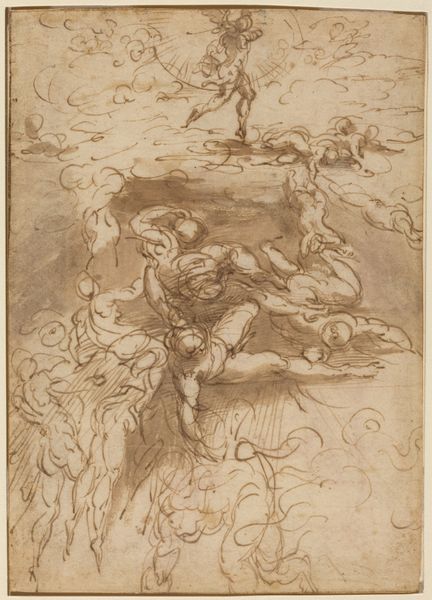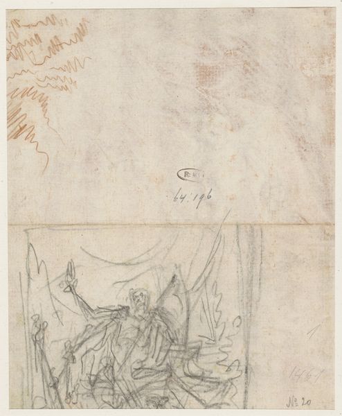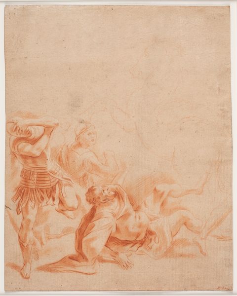 Curator: I’m struck by the raw energy emanating from this chalk drawing. What is your initial response? Editor: There's a quiet drama here, a sort of suspended anticipation. The red chalk lends it a warmth, but also an immediacy, almost as if the vision is unfolding before our eyes in real-time. Curator: Exactly. This piece, circa 1660, is Pier Francesco Mola's "Vision of Saint Bruno", currently residing at the Städel Museum. Mola captures the moment of Bruno’s enlightenment. The relatively loose sketching is interesting; history painting typically seeks high degrees of polish. Editor: Absolutely. And that roughness enhances the mystical qualities, doesn’t it? Notice the landscape—or lack thereof. There's a hint of nature around St. Bruno himself, then wisps dissipating upward, and almost nothing else, creating a stage for this profoundly personal moment. It suggests a transition, a shedding of the earthly for something divine. Curator: Precisely. Mola utilizes figuration here in conjunction with what barely constitutes landscape to create this emotional weight and amplify Bruno's solitary connection to the divine. Red chalk itself, a relatively immediate medium, also bolsters the sense of intimacy. He's not merely depicting the scene but rather providing us access to Bruno's spiritual state. Editor: And that head thrown back, the hand raised—the classic posture of revelation, of submission to something greater. The skull adds a fascinating element, the 'memento mori' constantly reminding him of the transitory nature of human existence, reinforcing Bruno's radical choice to embrace isolation and spirituality. Is this drawing of significance for his wider output, his overall development as an artist? Curator: While Mola is mostly known for his paintings, especially frescoes, it showcases his exceptional skill as a draughtsman. I think this artwork also anticipates trends. His work demonstrates the emotional turbulence and heightened spirituality that Baroque artists aimed to convey. In that regard, the work fits right into the moment. Editor: So we are invited not just to observe Saint Bruno’s vision, but perhaps also to consider our own search for meaning. Curator: Indeed. A work like this reveals much about artistic and social transitions during the period.