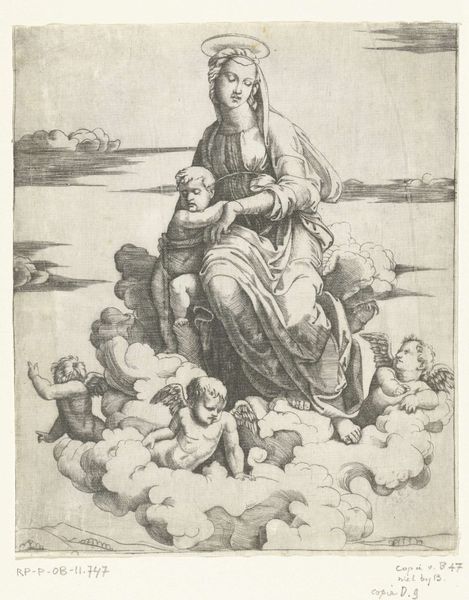 Curator: Welcome. Today we’re observing Jacob Binck’s engraving, “Maria met kind en Jozef,” which dates from between 1510 and 1569. It is part of the Rijksmuseum’s collection. Editor: It has such an overwhelming stillness. Mary’s expression is somber, almost melancholic, despite the bright halo and cherubs. It’s quite compelling, this emotional ambiguity. Curator: The engraving masterfully captures a complex interplay of motifs and Northern Renaissance ideals. We see the Virgin Mary, Christ as a young child, Joseph, and even a younger John the Baptist alongside Mary’s parents in the background. Apples are being offered to baby Jesus by Mary. The fruit symbolizes salvation, of course. Editor: It also symbolizes original sin; the dual symbolism makes for a charged moment. I'm curious how Binck uses the family to explore anxieties around gender roles and societal expectations placed on women and mothers, particularly through a religious lens. Curator: Look at Mary's elaborate hair, seemingly unbound and flowing behind her. Her cascading waves, the halo…the associations with earthly beauty alongside purity are complex, aren’t they? And the other child gestures towards what may be John the Baptist carrying the standard associated with his later recognition of Jesus. This imagery speaks to prophecy. Editor: I am struck, though, by Joseph's marginalized presence here. He is relegated to the edge of the image, almost an afterthought. Is Binck commenting on Joseph’s social and domestic role within the holy family? The marginalization almost highlights a wider discourse around male authority within religious narratives. Curator: Perhaps, but Binck also portrays him as a protective figure, subtly watching over Mary and Jesus. He also may serve as a grounded counterpoint to the celestial elements, such as the halo, to add an earthly dimension to this religious scene. Binck may not be challenging established structures, as he may be reinforcing them by illustrating familial roles. Editor: Fair. Yet even his quiet watchfulness seems fraught. It raises important questions around visibility, agency, and the subtle power dynamics present, particularly considering Mary is holding an apple. Curator: Such an artwork shows that even centuries later, art still challenges us to interpret and debate across our own evolving experiences. Editor: Indeed. It reminds us how critical visual analysis can be, for making the past more legible to our present.