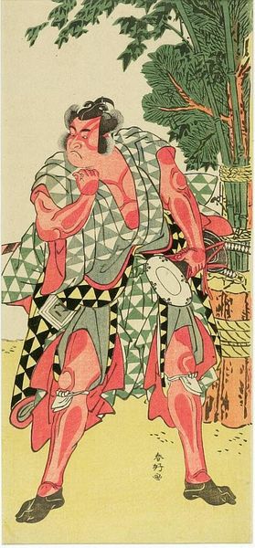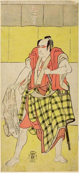 Curator: Here we have "Actor Nakamura Nakazo as an Otokodate" by Katsukawa Shunko, printed on paper and part of the Harvard Art Museums collection. Editor: Immediately, the checkered pattern of his robe jumps out, creating a visually arresting surface. The flatness of the print enhances its graphic quality. Curator: Indeed. The Otokodate, a type of chivalrous commoner, is a recurring figure in Kabuki. This portrayal captures more than just an actor; it represents cultural ideals of masculine virtue and loyalty. Editor: His expression is also very telling. The exaggerated features and the almost comical scowl tap into a tradition of theatrical mask-wearing, conveying layers of meaning beyond a simple portrait. Curator: The bold lines and color blocks serve to amplify the emotions projected through this carefully constructed persona. Editor: Thinking about it, this print becomes a fascinating point of intersection where theater, social values, and artistry converge. Curator: Precisely, a potent expression of culture in its own right.
