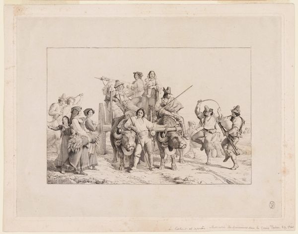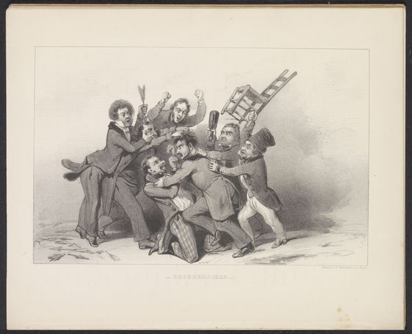 Editor: Here we have "Drie mannen in gevecht vertrappen Turk," which translates to "Three Men Fighting Trample Turk," a drawing and print made sometime between 1854 and 1876 by Carel Christiaan Antony Last. It's pretty intense... what do you see in this piece? Curator: I see a stark representation of power dynamics, reflecting the societal anxieties and prejudices of the time. Consider the loaded title – it immediately frames the scene through a lens of conflict and dominance. Editor: It's definitely not subtle. But why a Turk? What was going on then? Curator: The depiction of the Turk must be situated within the context of Orientalism and the pervasive "us versus them" mentality prevalent in 19th-century Europe. The figure being trampled is reduced to a symbol of otherness. How does the composition reinforce this reading? Editor: Well, the three men are much bigger and actively attacking, while the Turk is on the ground, being crushed. Curator: Exactly. Last uses this visual language to communicate a message about European superiority and the subjugation of the "Orient." It speaks volumes about how difference was perceived and treated. It’s also important to note how this image, circulated as a print, would have helped to reinforce these biased viewpoints among a wide audience. What responsibility, then, lies with the artist? Editor: That makes me think about the artist’s own biases being reflected in the art, and how it perpetuates those ideas. Food for thought! Thanks! Curator: Indeed. Art doesn't exist in a vacuum. Examining it through this lens allows us to critically assess the social narratives it upholds, and perhaps, challenge those narratives in the present.