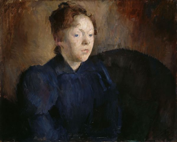 Curator: Let's discuss Harriet Backer's "Mrs. Vedastine Aubert," painted around 1910. Editor: Immediately, I'm struck by the color palette: a dominant blue for the sitter's blouse against that bold, unapologetic green backdrop. There's an honesty and lack of pretense in the rendering that feels profoundly modern, but perhaps melancholic? Curator: Backer, though often overlooked, was critical to introducing modernism to Norway. Her works consistently engaged with societal shifts—depicting interiority in the face of modernization. Consider Mrs. Aubert; she isn’t presented as ornament, but as a contemplative individual in a period of dramatic social transformation. Her gaze is knowing, reflecting a consciousness that transcends the domestic sphere. Editor: That crucifix, quite prominent against the blouse, suggests more than personal faith. It acts as an anchor, connecting her to a past as the world transforms, literally hanging as a reminder that value exists despite of modernity. She is physically central but rendered vulnerable by light. Note also how her hands, rather than holding a typical item or engaging in work, rest gently with a barely perceptible object nestled within them. Does it mean she is open and receiving? Curator: Backer’s Impressionist influences – the quick, loose brushstrokes – paradoxically contribute to a sense of permanence rather than fleetingness, don't you think? It gives presence to the individual. In this context, we are offered the question about visibility, class and gender that shape women's identity in Norway at this time, specifically concerning class and intellectual work. Editor: Interesting, and those visual elements become more powerful with that perspective, thank you. I now understand the quiet power held by this seemingly understated woman. Curator: It's rewarding when an artwork that might initially appear conventional reveals its depth with some additional layers of thought. Editor: I agree. It reinforces the notion that portraits contain untold stories, quietly waiting for someone to interpret them and that no element is a decoration, everything adds up to give the audience the true meaning of a face, even without words.