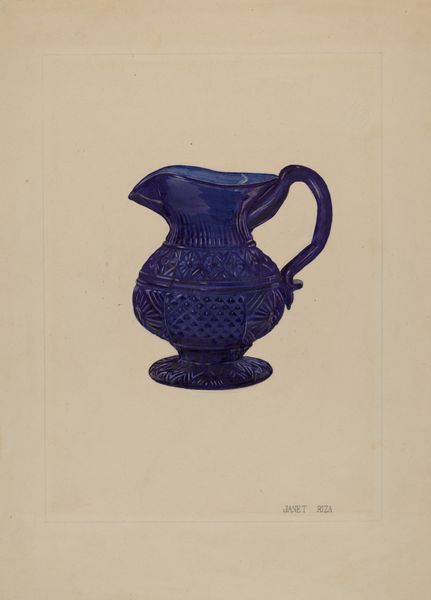 Curator: I'd like to introduce Vincent Burzy’s "Pitcher," a watercolor and drawing created sometime between 1935 and 1942. What is your first impression of this, our single object of attention? Editor: I'm immediately drawn to the monochrome blue, a unifying colour scheme with a limited range, imbuing the picture with serenity. The artwork creates an ethereal and cool mood overall. The execution is detailed with close observation to form and lighting of a real-world pitcher. Curator: Indeed, and considering the socio-political context of the 1930s and early 40s—the Depression, the rise of Fascism, and, of course, World War II—this choice of representing a common object such as a simple pitcher as a vessel can perhaps suggest stability. Editor: That is interesting in the face of the storm and the turbulence you are depicting in Europe and North America, such choices have powerful messages through common symbolisms like a simple object. In many traditions, a pitcher also is representative of purity and cleanliness and often the act of pouring liquids can represent sharing and giving in difficult situations. Curator: That interpretation highlights a critical intersection of art, culture, and social commentary. Also, how would you consider such a specific style – this 'realism', within this environment? Can that combination provide a cultural purpose? Editor: The use of the symbol in a realist, meticulous, yet accessible rendering feels like it democratizes the experience of connecting with these deeper meanings. Making this symbolism available to all through easily-deciphered iconography feels deeply generous in a historical period that brought separation and war. Curator: That is such a brilliant approach and in our current turbulent historical period there may be an importance to going back to simple values represented through art, of social integration rather than fragmentation. Editor: This exploration really enriches my experience and offers a more grounded context for a deeper understanding of its function, making it an even more intriguing symbol.