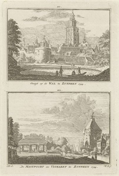 Editor: So, here we have "Twee gezichten op kasteel Beverweerd bij Werkhoven," or "Two views of Beverweerd Castle near Werkhoven," an engraving by Hendrik Spilman from the mid-18th century. The crisp lines give the castle a sense of solid permanence. It really captures a sort of fairytale, historical mood to me. As an iconographer, what do you see in this piece? Curator: It's fascinating how Spilman uses these two views to capture not just the castle's architecture, but also its symbolic weight. Castles often represent power, security, and heritage. But look closely. Do you see how the top image presents the castle from a distance, almost ethereal? The bottom view is more grounded, detailed. Editor: Yes, I notice how in the first one the details seem to fade into the landscape, and the second has a much sharper view. Curator: The shift in perspective suggests a nuanced understanding of what a castle represents. From afar, it's a symbol, a concept. Closer, it becomes a place, inhabited by history, human activity, and vulnerability. Do you think the artist made the castle into a kind of protector in the landscape? Editor: I see that point in terms of symbolic function, or maybe as a cultural artifact that holds space. How architecture might evoke emotions and memories, even influence a viewer's perception. Curator: Precisely! Spilman’s work preserves a specific moment and place, yes, but also engages with how we remember and value them. Notice how the architectural detail becomes symbolic detail. It reminds us of our ability to protect, endure, and exist over time. Editor: I never would have noticed that at first glance! It shows how the meaning in art deepens when you consider its layered history and the stories these kinds of visual elements carry forward. Curator: Exactly. It becomes clear how architectural form can shape emotional landscapes through generations.