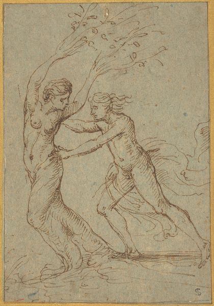 Giulio Romano likely made this drawing of Daedalus and Icarus in the first half of the 16th century, using pen and brown ink with brown wash over black chalk. The effect of the drawing is dependent on the artist’s mastery of the tools available to him. Look closely and you'll notice the dynamic cross-hatching and the delicate lines. The pen and ink, combined with the brown wash, allows Romano to build volume and depth, to create the illusion of three-dimensionality. Romano worked in the High Renaissance, a period in which the status of the artist was elevated. As such, drawing was not simply a preliminary step towards a finished painting or sculpture, but a valued end in itself. The artist’s virtuosity is central here. But consider too, that this image has a clear narrative: the ill-fated flight of Icarus, who flew too close to the sun and plummeted to his death. It is a story of the dangers of over-reaching, a theme as relevant to artistic ambition as it is to life.