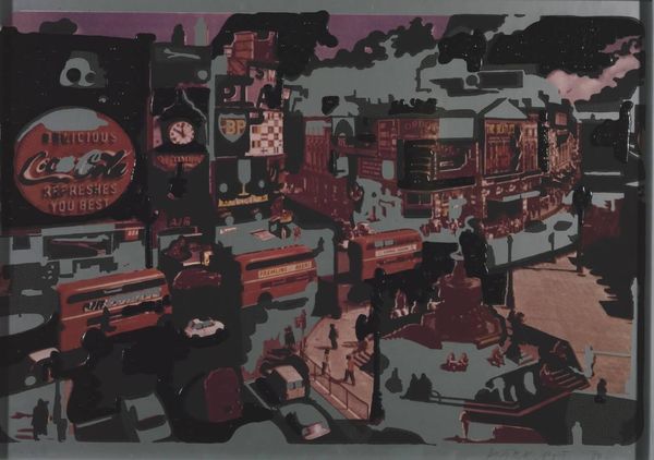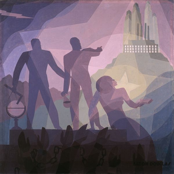 Editor: So, this is Aaron Douglas’s "Building More Stately Mansions," painted in 1944. It's got such a strong sense of layering and shadow. How do you interpret this work, with all its historical and architectural imagery? Curator: The layering is key, isn't it? Douglas presents us with a palimpsest of civilization. Observe the superimposition of Egyptian, Greco-Roman, and modern American architectural motifs. These aren’t merely buildings; they are visual signifiers of cultural power, artistic achievement, and societal evolution—or, perhaps, its cyclical nature. Editor: A palimpsest… I like that. So it’s like history being rewritten, but traces of the old always show through? Curator: Precisely. Note how Douglas employs silhouettes of laborers building upon and around these monuments. Their postures—some kneeling, others wielding tools—evoke both reverence for the past and active participation in shaping the future. Consider the emotional resonance of each of these symbols – what is being built and at what cost? What stories are these shapes telling? Editor: That’s really interesting. The people seem almost like ghosts, or shadows of those who came before. Curator: And doesn't that speak to cultural memory itself? The past isn't dead; it’s living within us, informing our present actions. What about the color palette – does that tell you anything? Editor: It's almost entirely shades of red and purple, some pastel, some stronger. Almost like sunset hues that may point to closure, but also point to a new dawn in history. Curator: An astute observation! That tonal range reinforces the idea of transformation and enduring legacy. Douglas presents the idea that symbols themselves morph, adapting over epochs. The mansons aren't just houses but metaphors for the architecture of social transformation Editor: I see it differently now. I was just seeing architectural references, but there is also so much emotional nuance rooted in cultural progress, tradition, and memory that connects each of us together!
